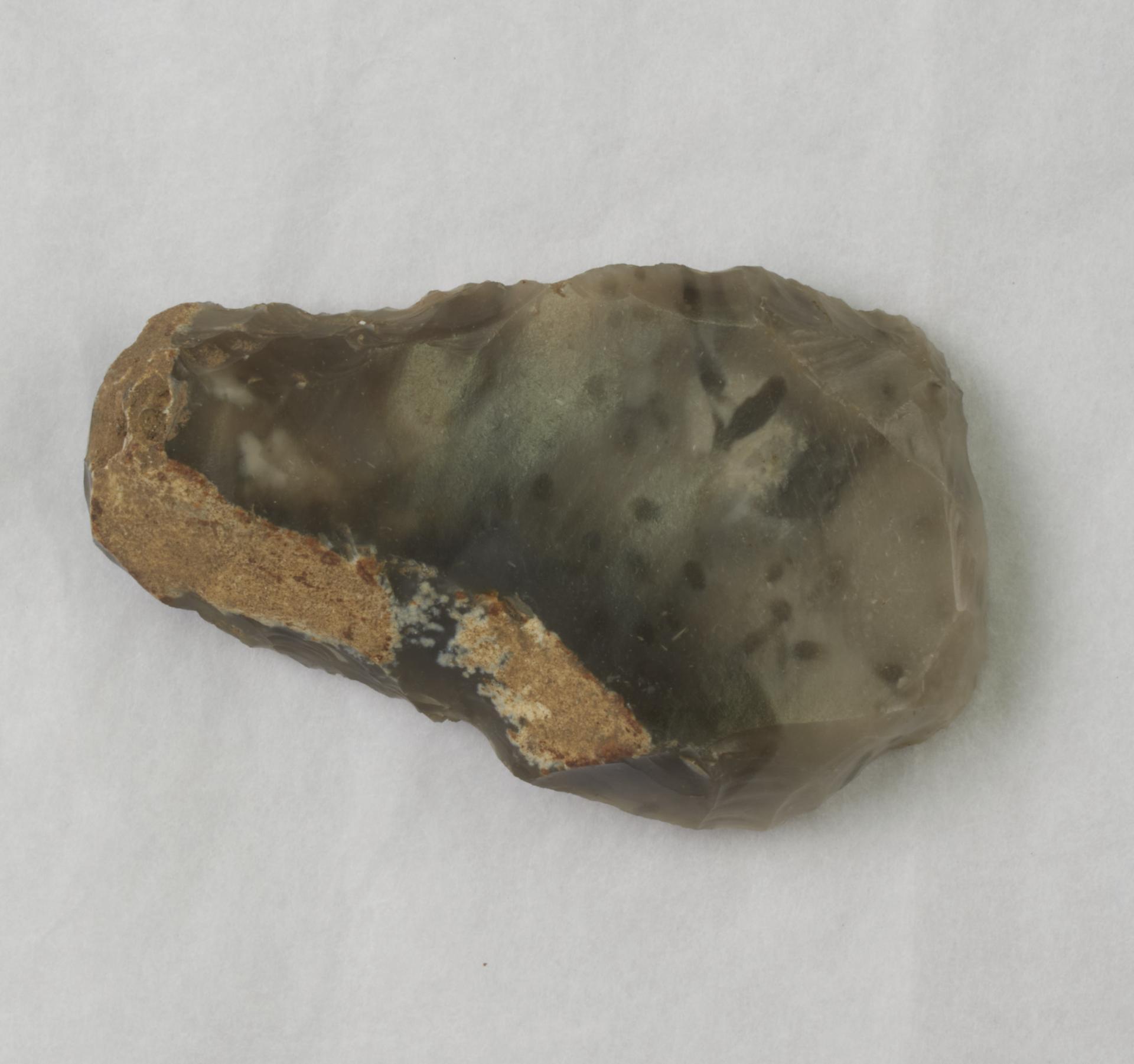 Flint scraper. Possibly a side and end scraper. Both long and distal edge have been retouched. Partial cortex on one side.
