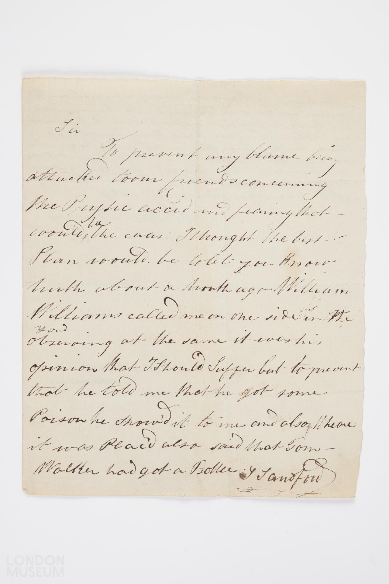The letter reads: Sir To prevent any blame being attached to our friends concerning the Prussic acid and hearing that would be the case I thought the best plan would be to let you know truth about a month ago William Williams called me on one side in the yard observing at the same it was his opinion that I should suffer but to prevent that he told me that he got some poison he show'd it to me and also where it was placed also said that Tom Walker had got a bottle S Sandford'.