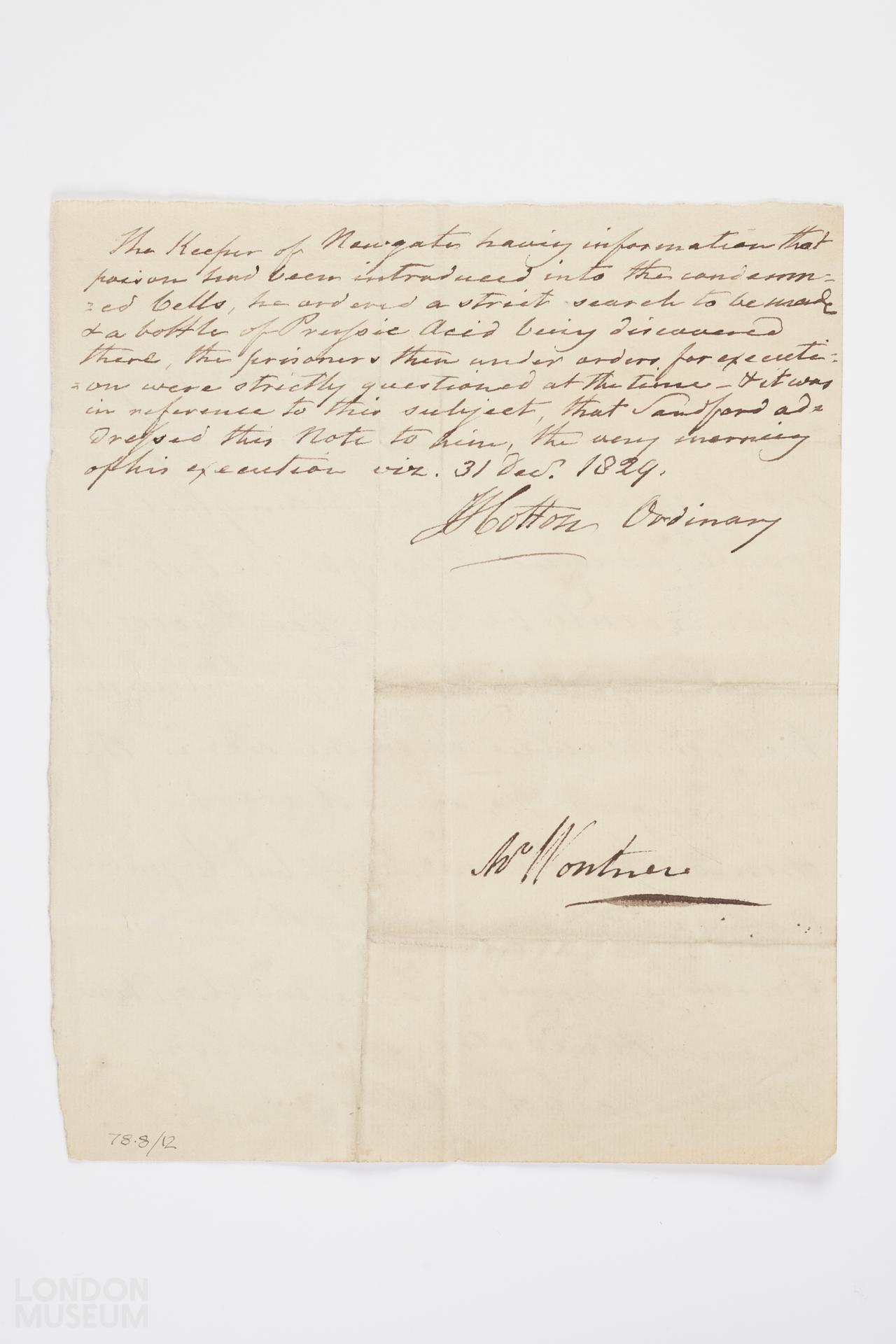 On the reverse of the letter is an annotation by the Reverend Cotton that reads 'The Keeper of Newgate having information that poison had been introduced into the condemned celss he ordered a strict search to be made and a bottle of Prussic Acid being discovered there, the prisoners then under order for execution were strictly questioned at the time and it was in reference to this subject that Sandford addressed this note to him the very morning of his execution viz 31 Dec 1829 Cotton Ordinary'
