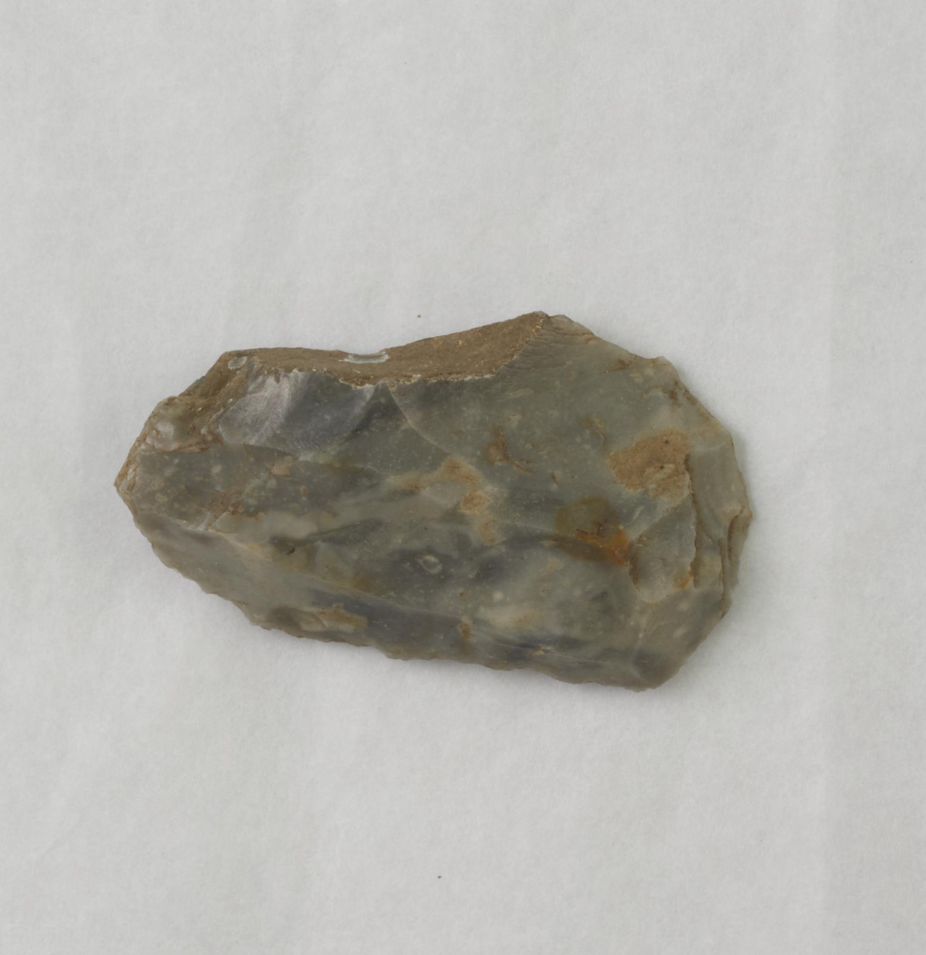 Flint scraper. Roughly rectangular in shape with a rounded end. Possibly an end scraper. Distal end has been retouched. Grey in colour. Smooth on one side.