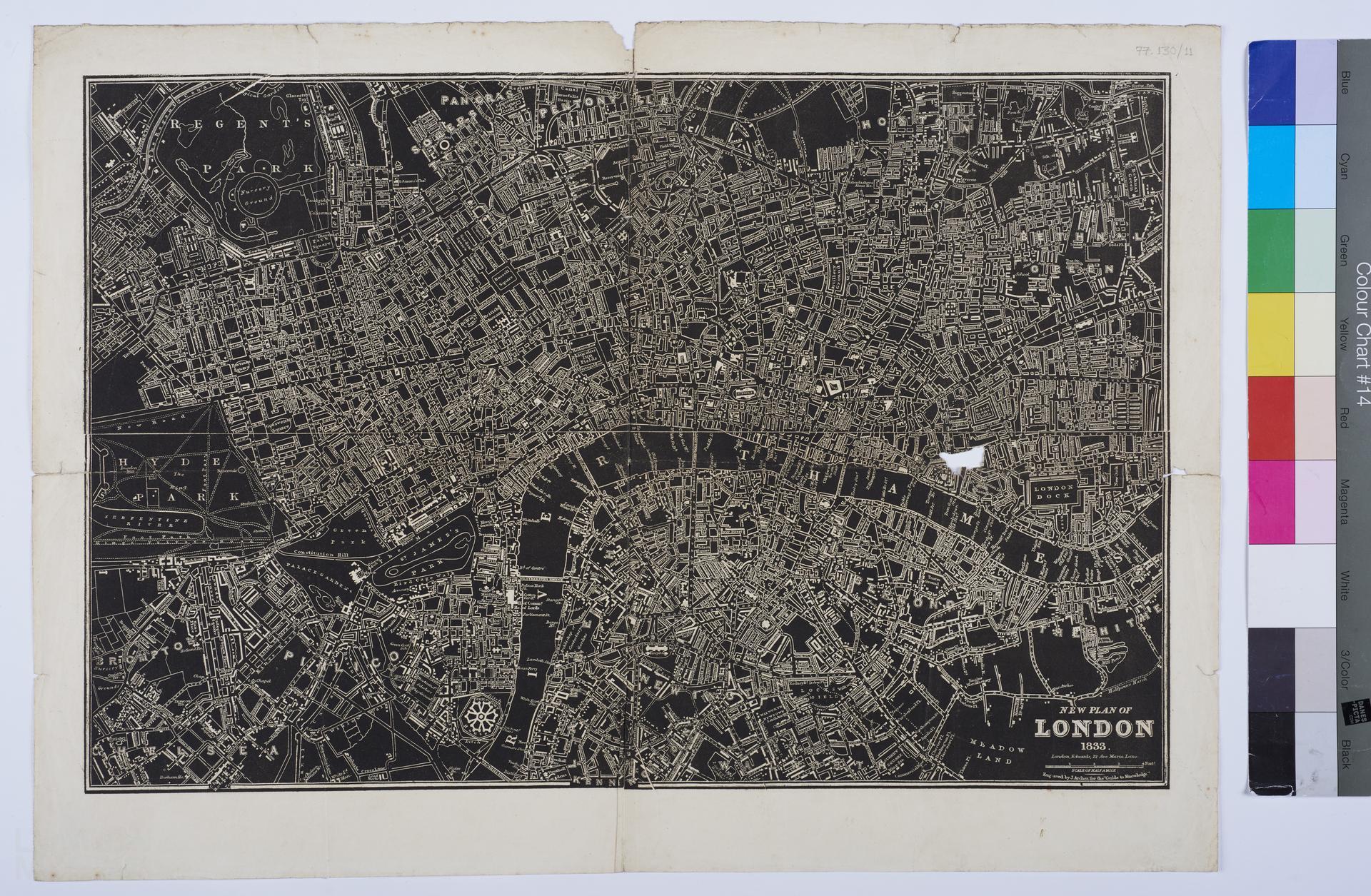 Plan of London engraved by Joshua Archer for the 'Guide to Knowledge', 1833. White on black. First edition. Title: 'NEW PLAN OF LONDON'. Extent: Pentonville, Wapping, Kennington and Brompton.