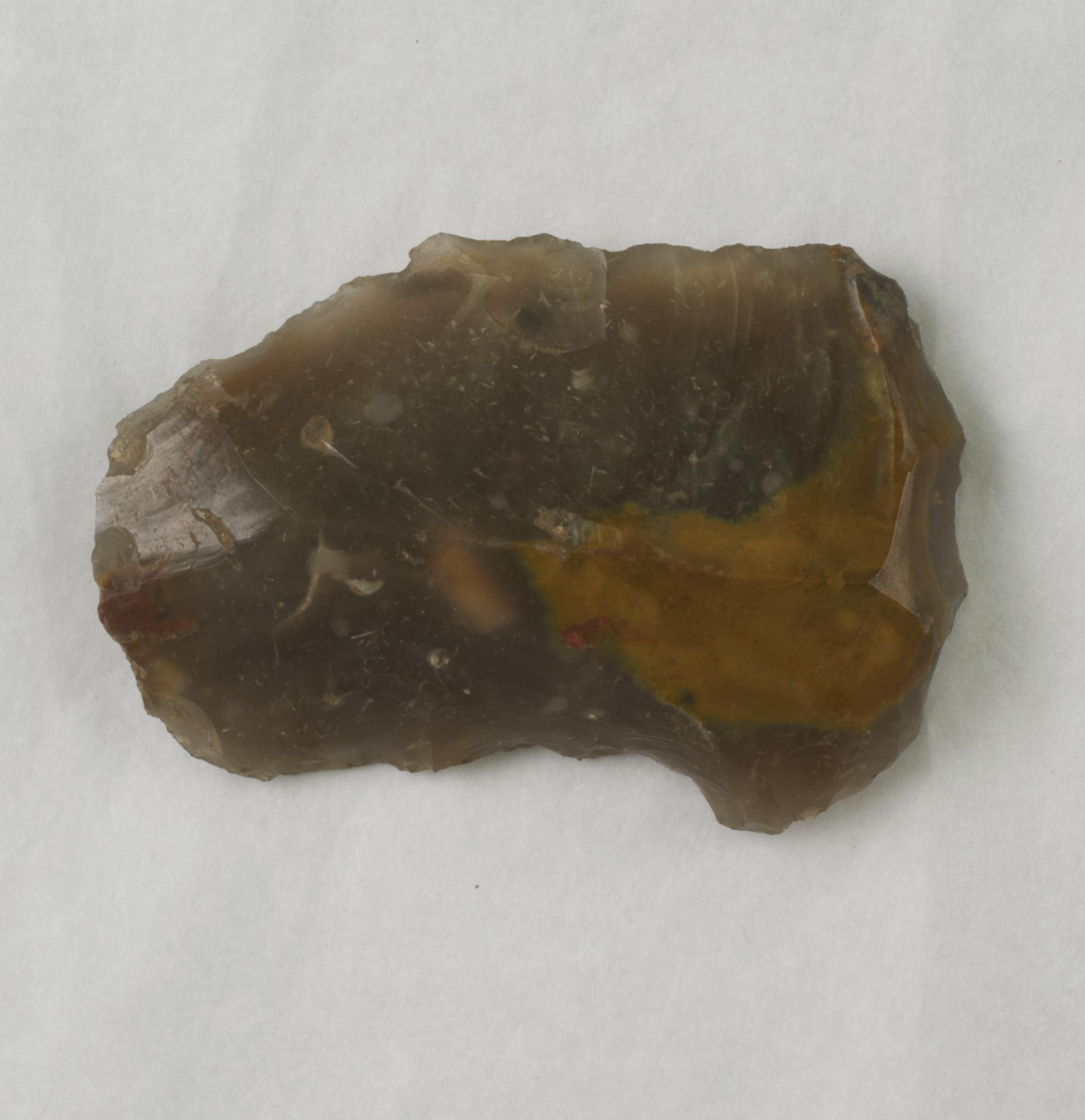 End scraper of bullhead flint. Roughly rectangular in shape. Smooth on one side. Distal end has been retouched.