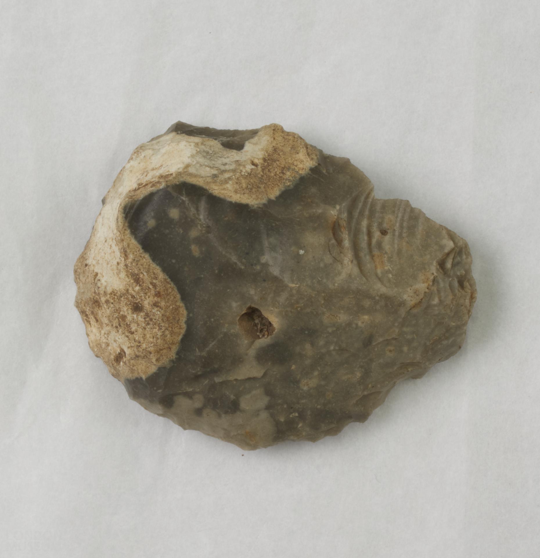 Flint scraper. Possibly a side scraper. Partial cortex at one end. Partially smooth on one side. Grey in colour. Roughly oval in shape.