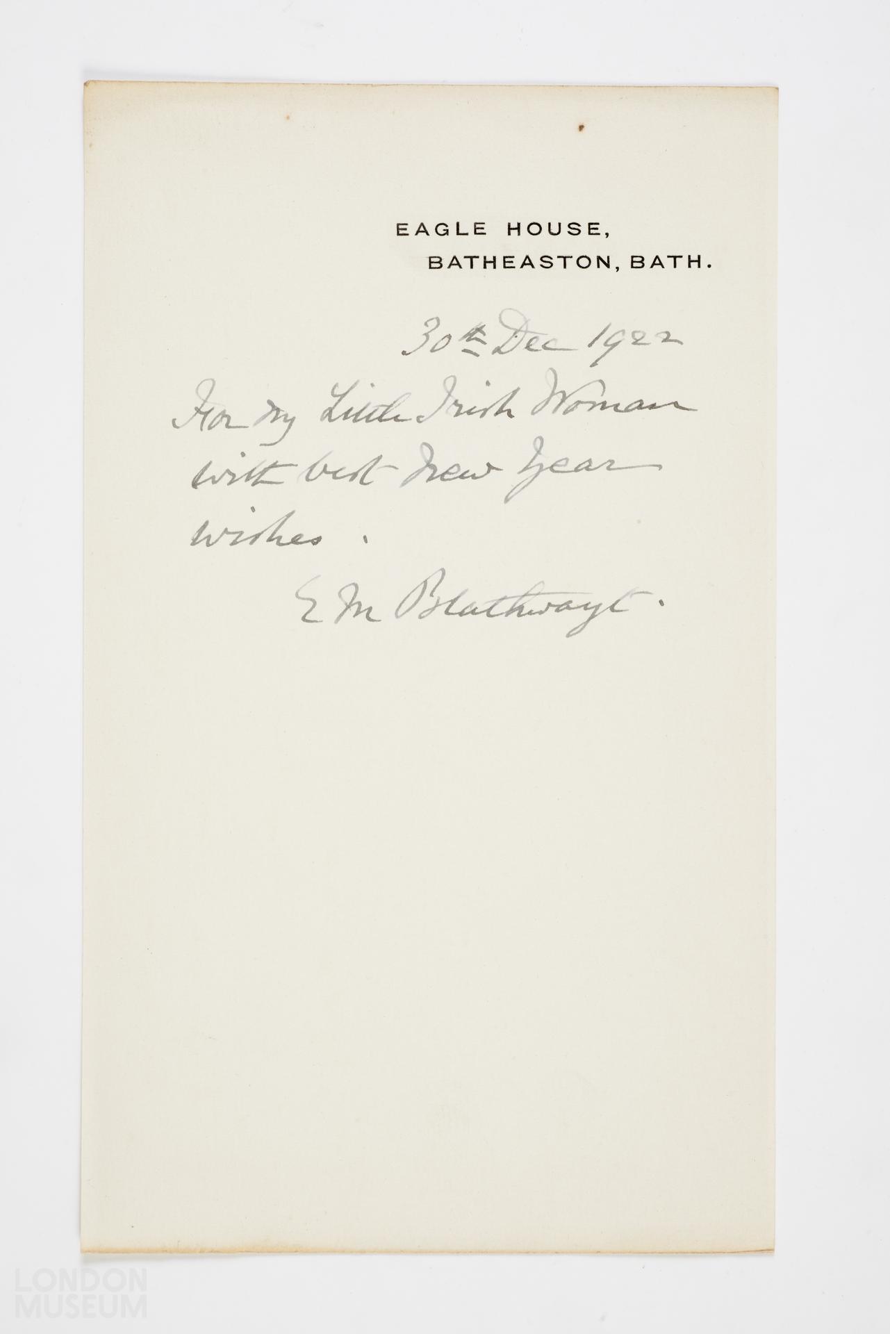 A letter from Eagle House, Batheaston, Bath, 30th December 1922 reading: "For my little Irish Woman with best New Year wishes E.M. Blathwayt".