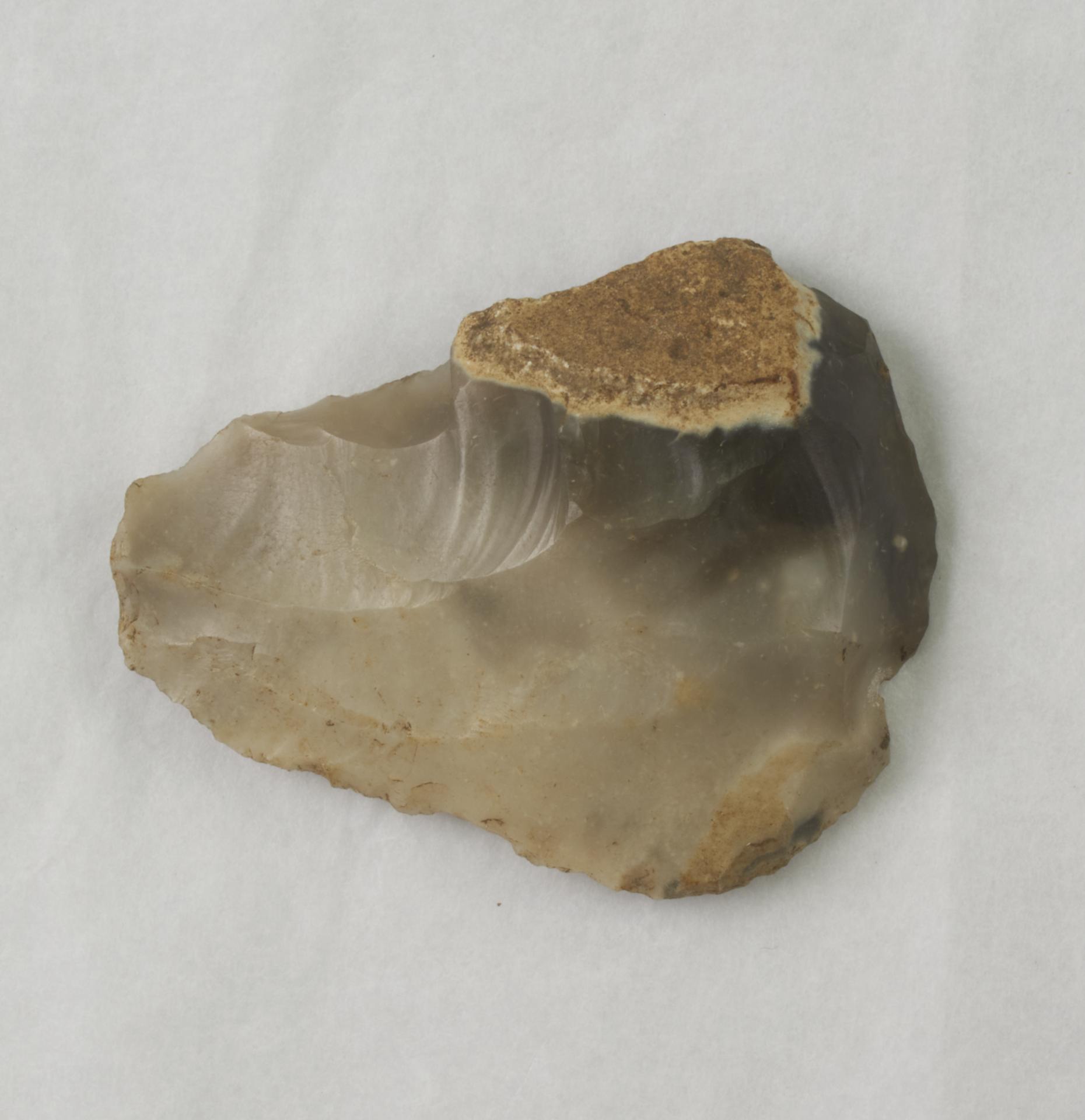 Flint scraper. Possibly a side and end scraper. One long edge and distal edge has been retouched. Partial cortex on one side. Smooth on one side. Light and dark grey in colour. Roughly triangular in shape.