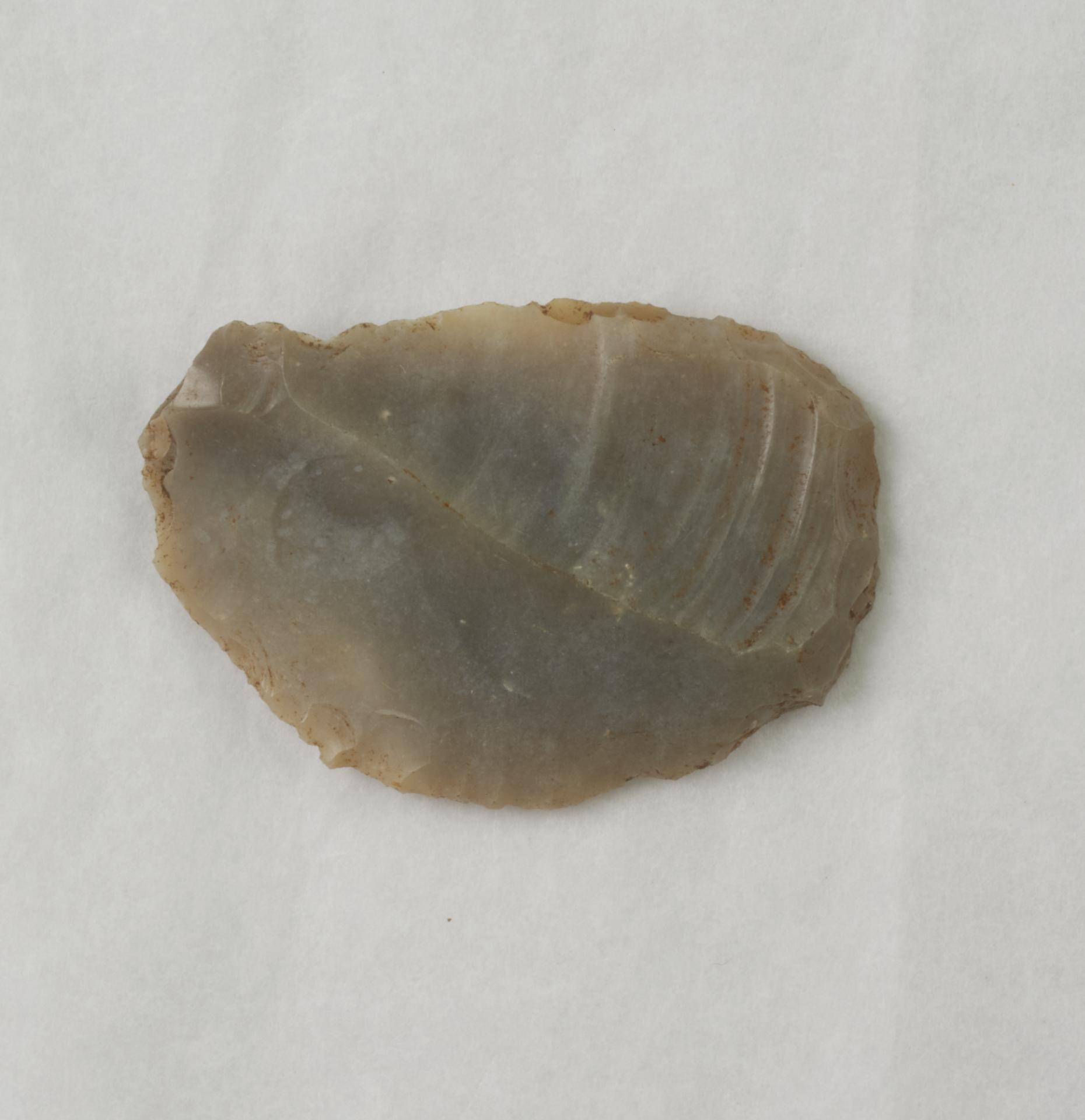 Flint scraper. Possibly a disc scraper. Nearly the whole edge has been retouched. Roughly oval in shape. Light grey in colour.