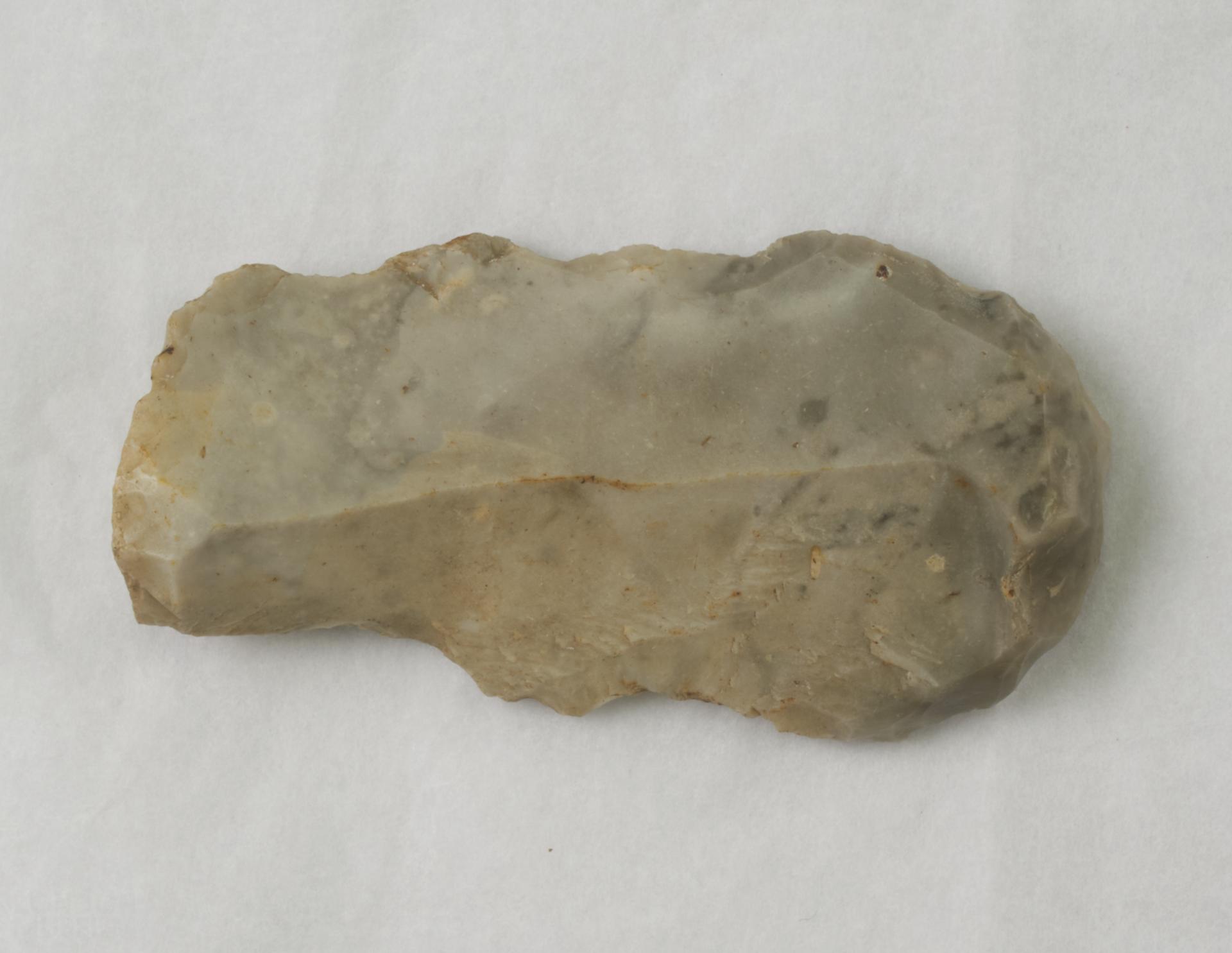 Flint end scraper. Roughly rectangular in shape. Light grey in colour. Smooth on one side. Central ridge on the other.