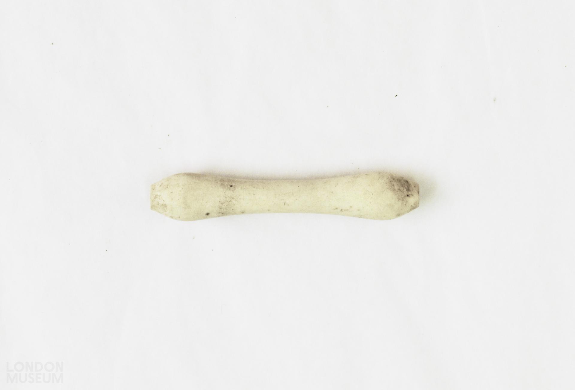 Clay wig curler stamped "WB" with a crown above.