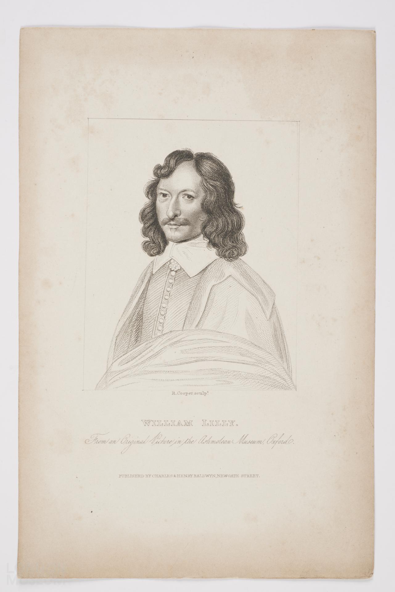 William Lilly, astrologer 1602-1681, "from an original picture in the Asholean Museum, Oxford". "William Lilly was the foremost English astrologer of the 17th century. Born May 1, 1602 in Diseworth, Leicestershire, he began studying astrology in 1632. In 1641 he began a professional practice and soon became heavily involved with the Parliamentary side in the English Civil War. It was said that if King Charles I could have brought over Lilly he would have been worth a half a dozen regiments. Lilly published many astrological almanacs and in 1647 wrote Christian Astrology, the most definitive work on horary astrology ever written in English. He is perhaps most famous for predicting the Great Fire of London in 1666.