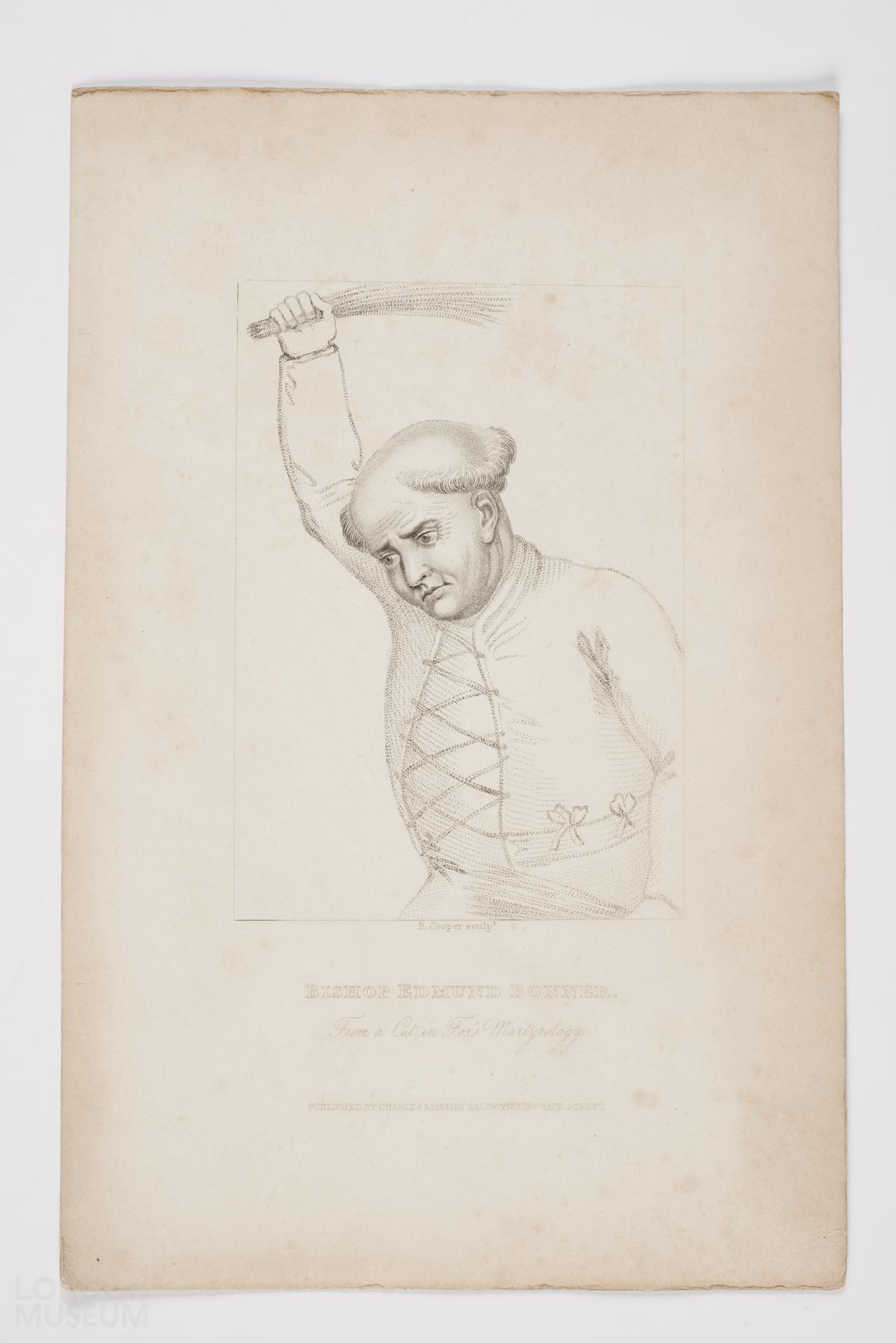 Bishop Edmund Bonner "from a cut in Fox's Martyrology" showing him with a flail raised above his head. Bonner (1500?-1569) was a Catholic bishop of London responsible for much persecution of Protestants. He refused to take the Oath of Supremacy to Elizabeth I, was deposed and imprisoned in the Marshalsea where he died in 1569.