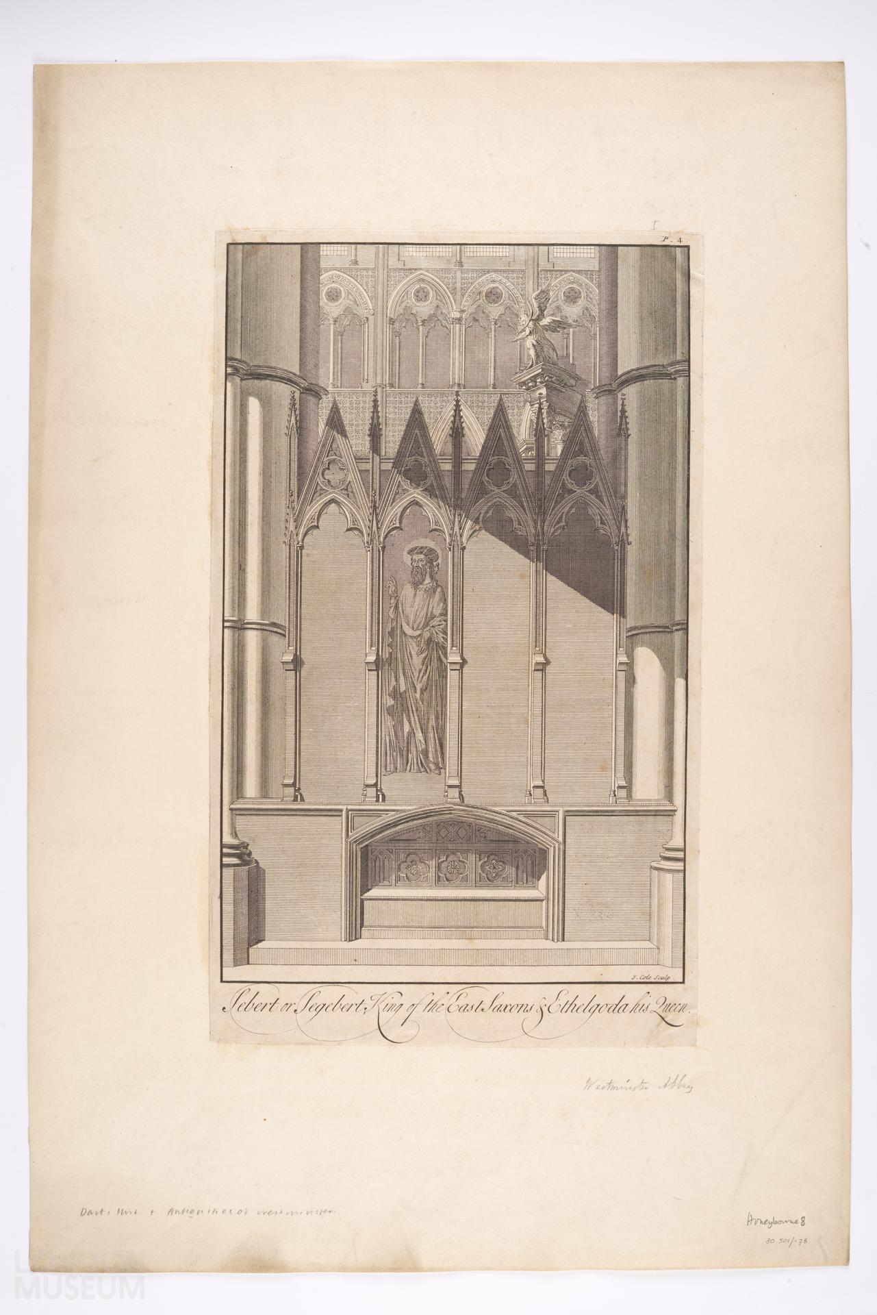 Monument to Sebert or Segebert, King of the East Saxons and Ethelgoda his Queen. From John Dart: Westmonasterium, or, The history and antiquities of the abbey church of St. Peters Westminster : containing, an account of its ancient and modern building, endowments, chapels, altars, reliques, customs, privileges, forms of government &c. with ye copies of ancient Saxon charters &c. and other writings relating to it ... To which is added, Westminster Abbey, a poem ... by the same author ... London : Printed & sold by James Cole, engraver in Hatton Garden, Joseph Smith print seller near Exeter Exchange, Tho. Bowles, print seller in St. Paul's Church Yard, Jer. Batley, book seller in Pater noster Row, Tho. Taylor, print seller in Fleet Street, John Bowles, print-seller over against Stocks-Market, and by Andrew Johnstone in Round-Court in ye Strand, [1723].
