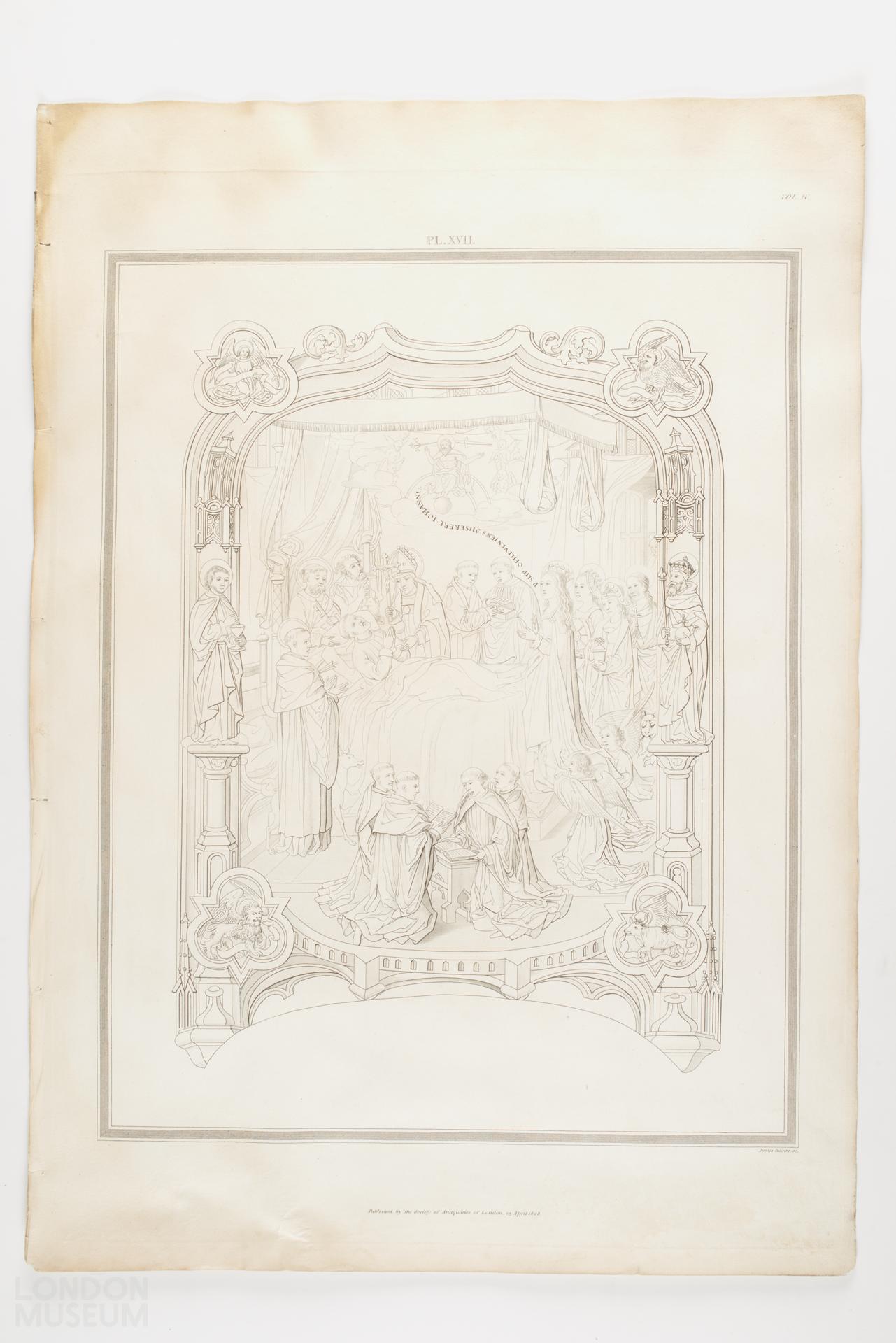 See 80.501/463. This compartment of the vellum roll shows John Islip on his deathbed.