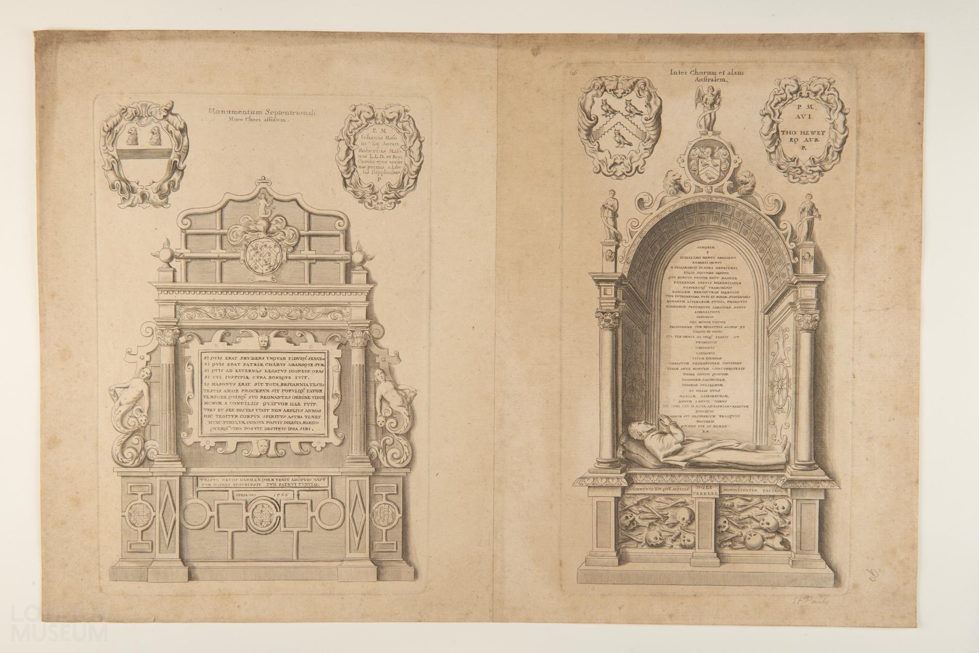 Monumentum Septentrionali Muro Chori Affixum - the tomb of John Mason, Knight, 1566, situated on the northern wall of the choir in Old St Paul's, complete with Latin inscription. Possibly from Sir William Dugdale's History of St. Paul's Cathedral, first published 1658, second edition 1716, in which case by Wenceslaus Hollar.