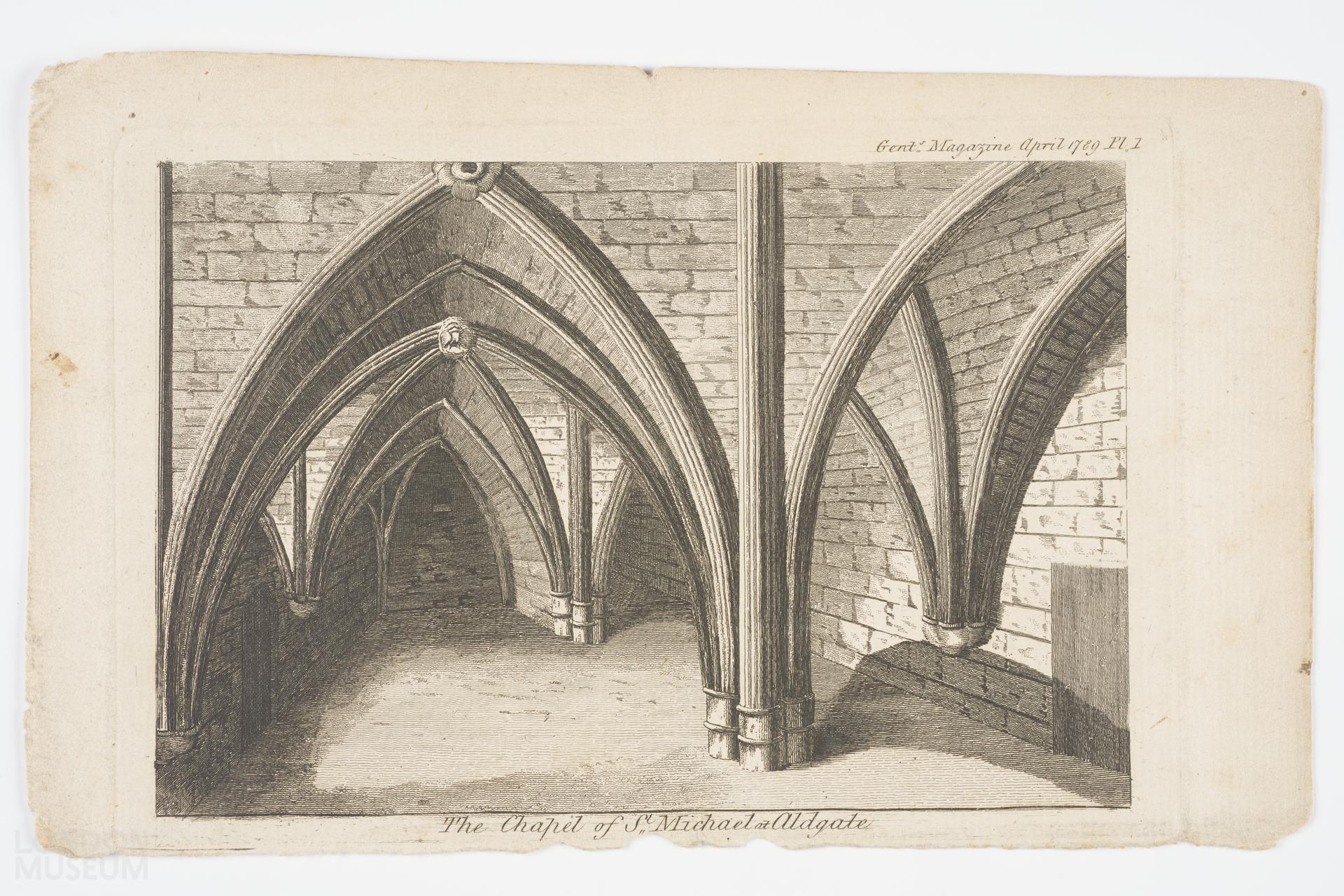 The Chapel of St Michael at Aldgate - a low-vaulted cellar. Printed at the top right of recto: 'Gent. Magazine. April 1789. Pl. 1'.
