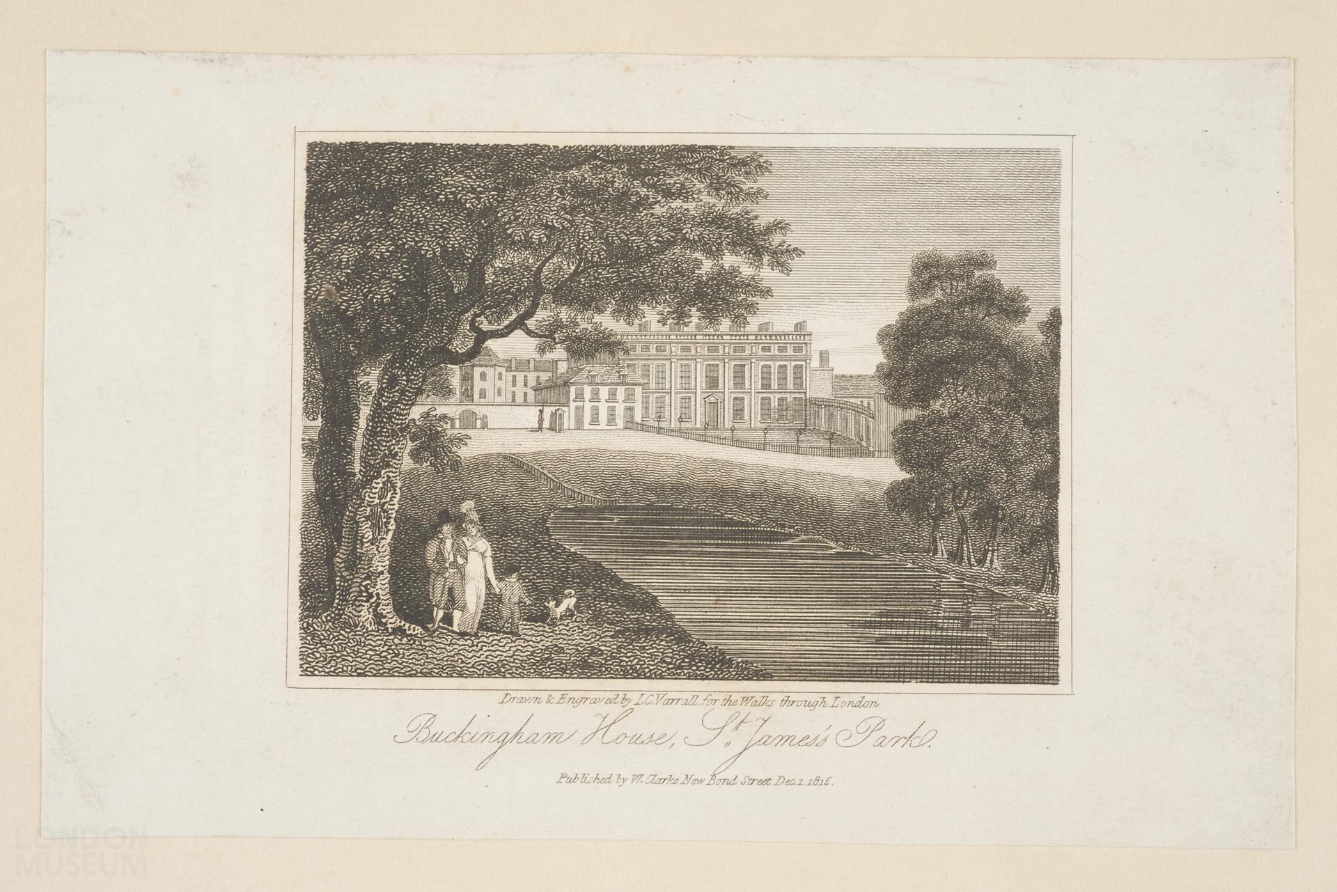 Buckingham House, St James Park, with the end of the canal in the foreground. View of the house before Nash's reconstruction. Drawn and engraved for "The Walks through London".