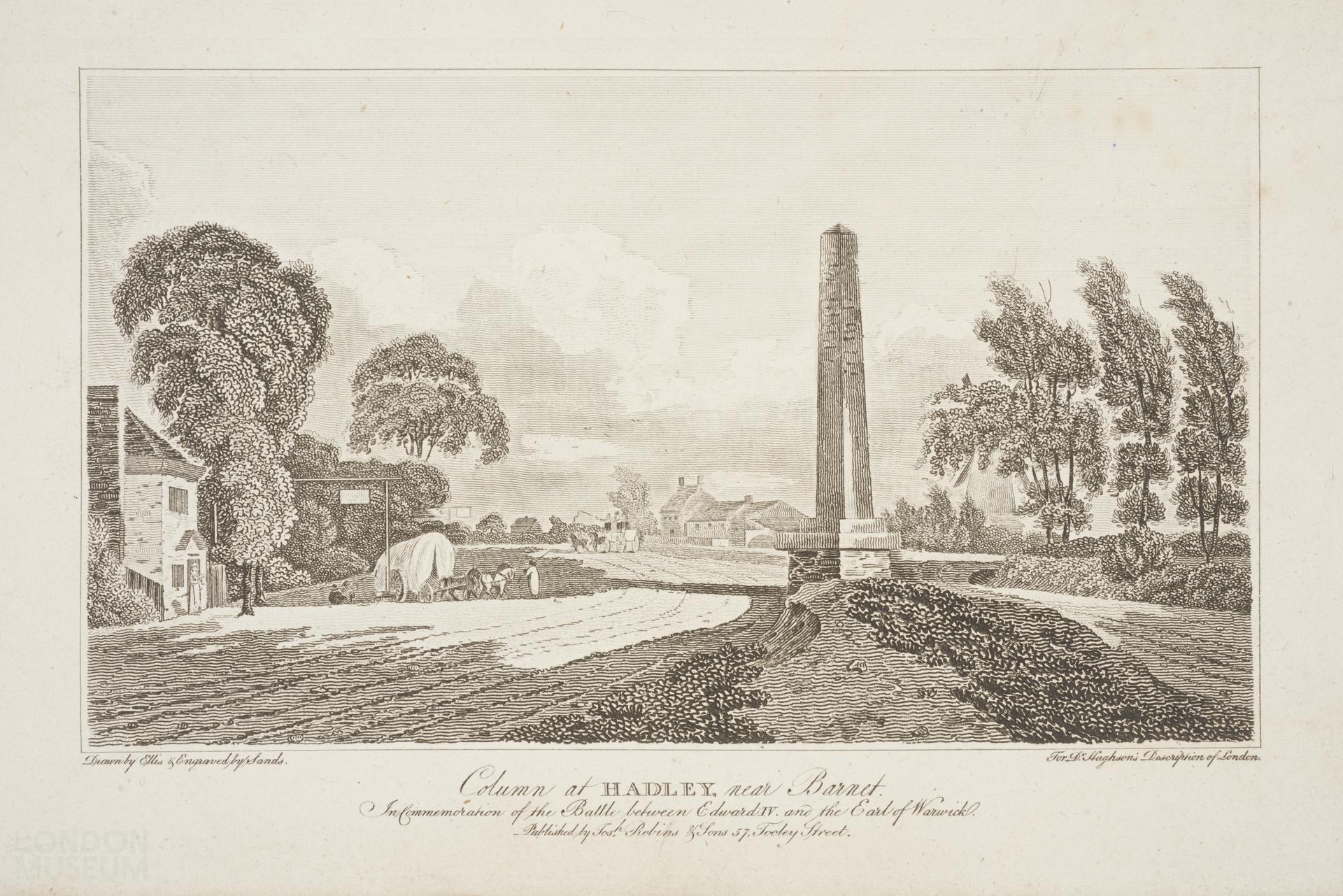 Column at Hadley near Barnet, in commemoration of the battle between Edward IV and the Earl of Warwick. There is a broad road leading either side of the central column, and a covered wagon is leaving an inn on the left, while a more distant carriage passes wayside buildings including another inn. The Battle of Barnet in 1471 established the Yorkist Edward IV on the throne; the column was erected in 1740 by Sir Jeremy Sandbrook. For Dr Hughson's Description of London. The descriptive cutting is a gazeteer entry for Barnet.