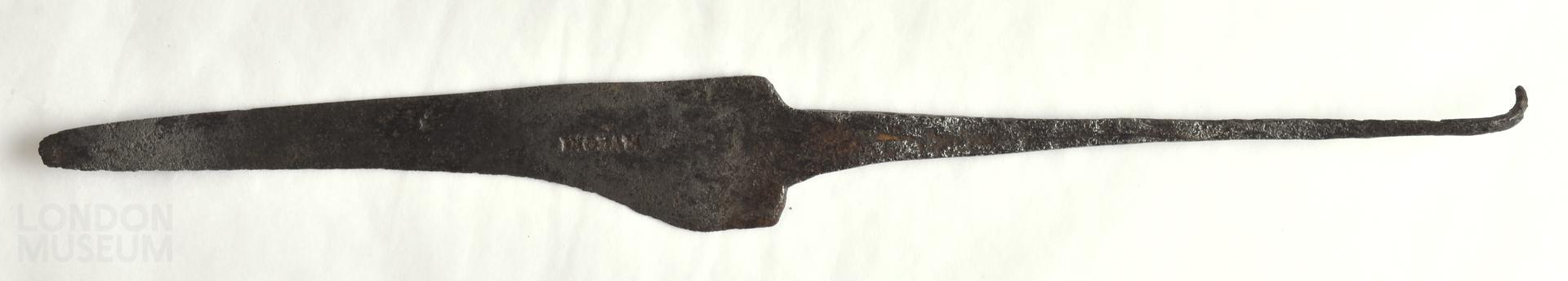 Metal knife with long, thin tang curved at the end for the handle to be fitted to. Blade is stamped 'INGRAM' and has been ground away.