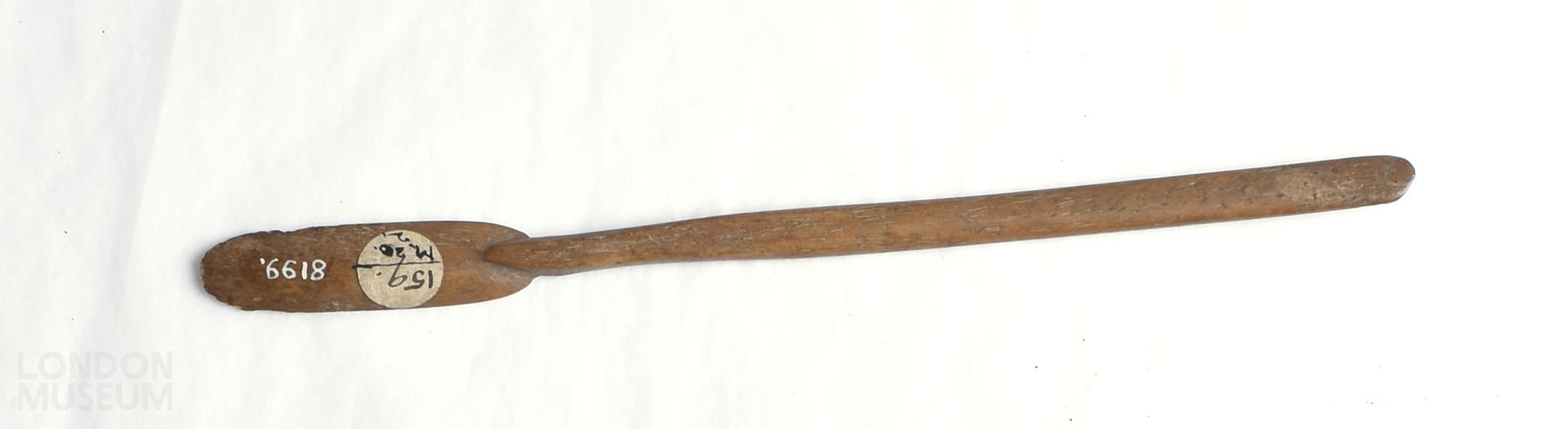 Bone spoon with a long bowl and stem terminating in a long handle with a shallow groove.