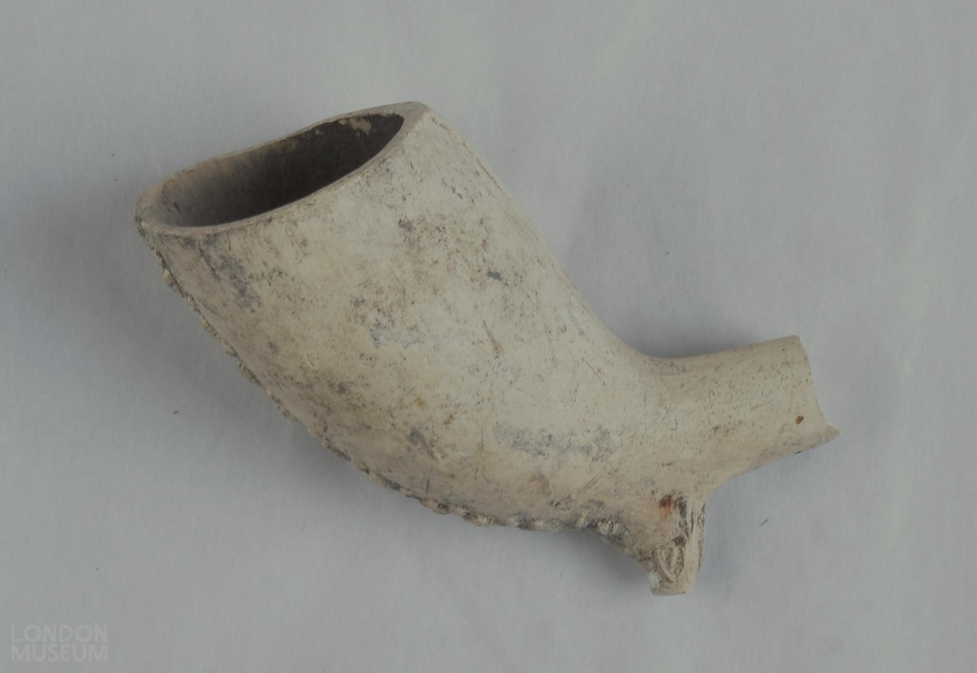 Clay tobacco pipe, heart design on spur and leaves vertically on bowl front.