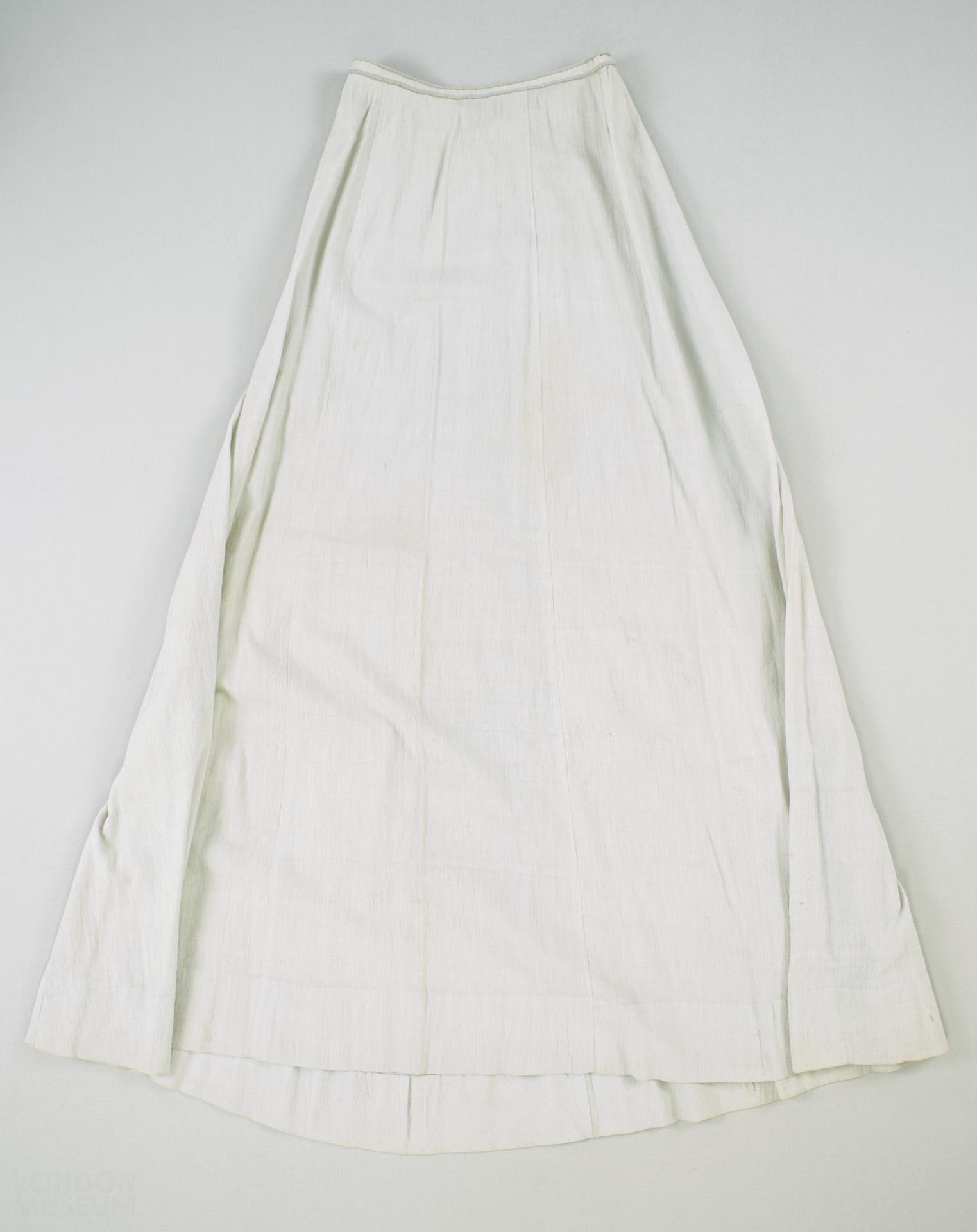 Skirt of light grey-blue cotton with slightly raised surface (like cheesecloth). Constructed in five panels with darts to front of hips and back panels slightly gathered up to centre back opening. Two hook and eyes to fasten along narrow waistband and a hook and eye half way down the back opening. Two rows of blue grey cord sewn along the waistband.