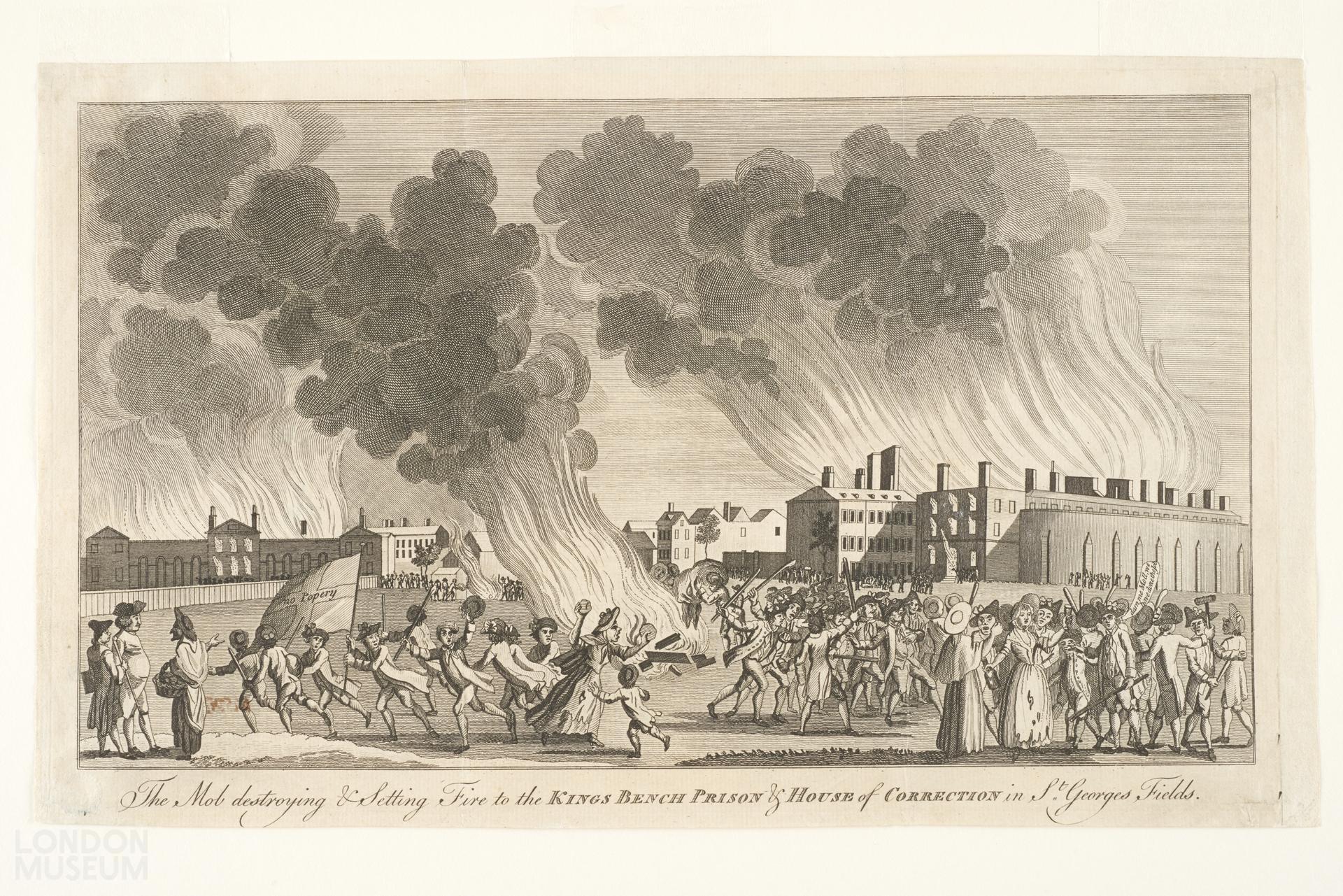 - The mob, destroyed and setting fire to the King's Bench prison and House of Correction in St George's Fields