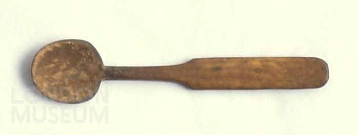 Bone spoon with a circular bowl. The stem broadens into a rectangular handle with a rounded end.