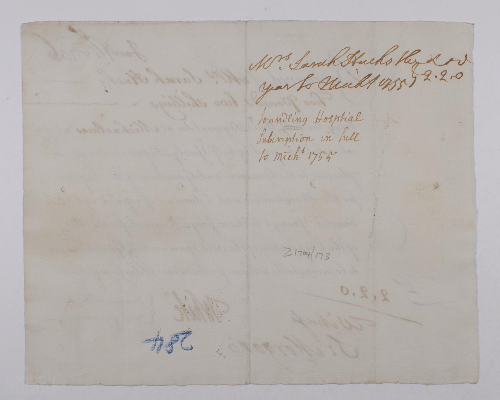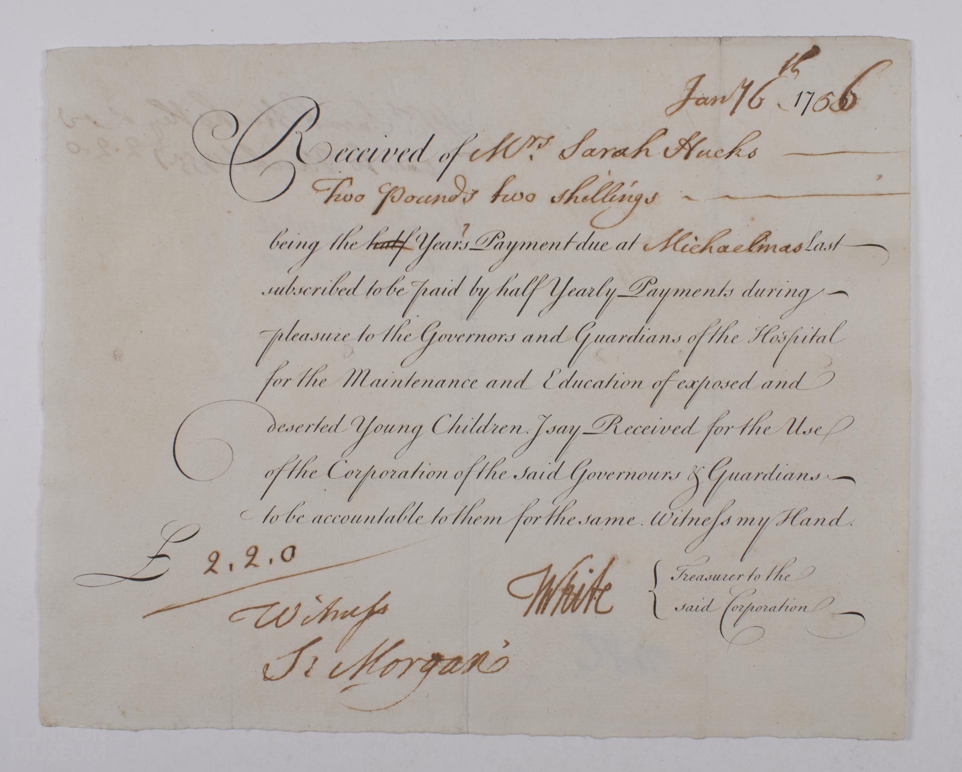 Receipt for Foundling Hospital subscription dated January 16th 1756, for the sum of £2 and 2 shillings.