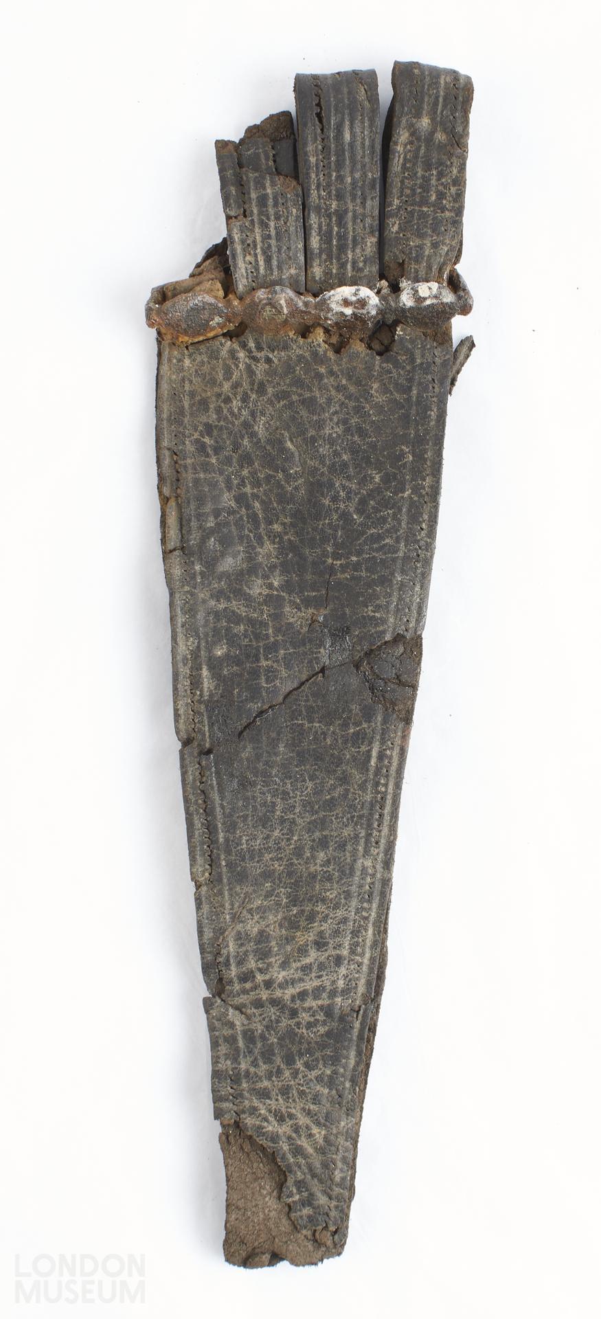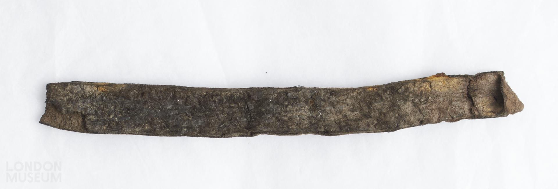 Collection of leather sword belt fittings and associated iron metalwork.