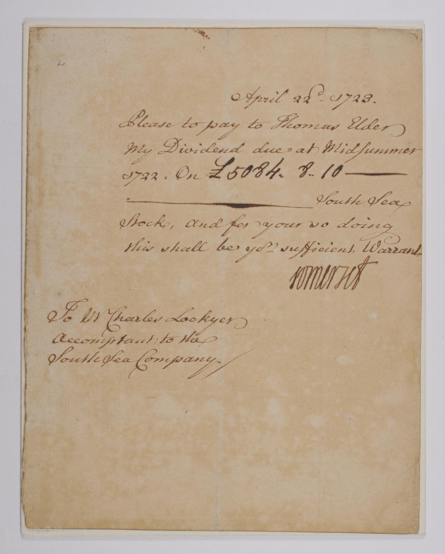 Declaration of Duke of Somerset's authorisation for a dividend payment to Thomas Elder dated 22 April 1723. Text reads "Please to pay to Thomas Elder My Dividend due at Midsummer 1722. On £5084.8.10- South Sea Stock, and for your so doing this shall be your sufficient Warrant. (Signed) Somerset." Addressed "To Mr Charles Lockyer Accomptant to the South Sea Company".