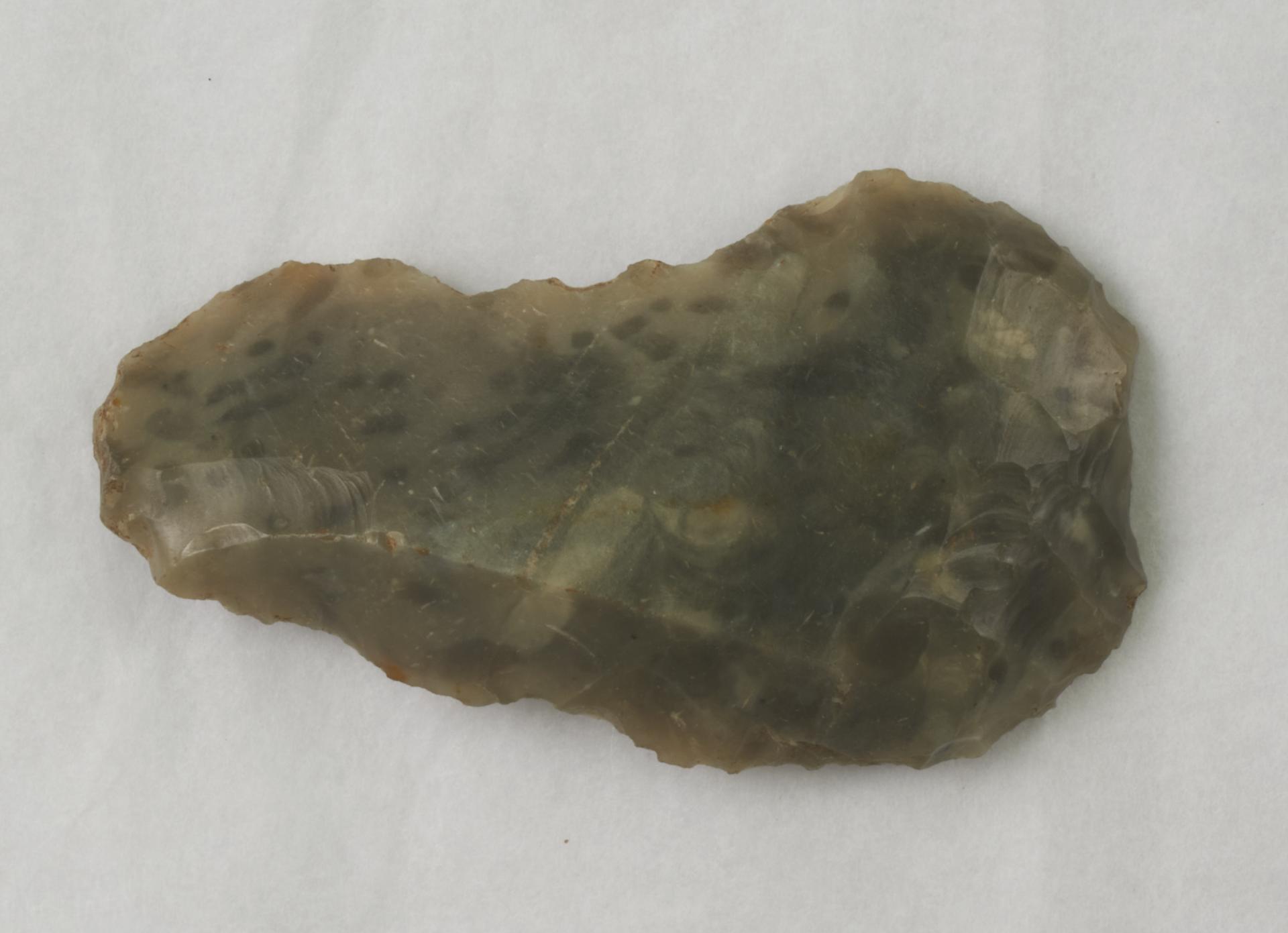 Flint scraper. Roughly rectangular in shape. Possibly side scraper. One long edge has been retouched.