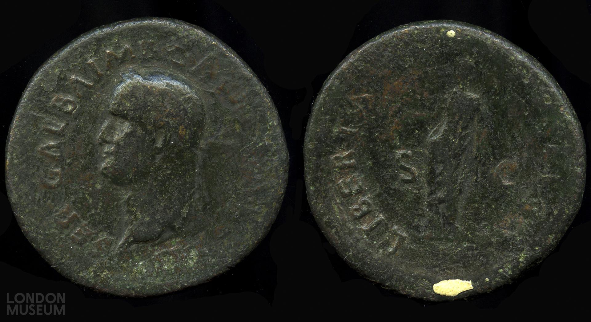 A copper alloy sestertius coin of Emperor Galba, ruler of the Roman Empire, AD 68-69. The back of the coin depicts Libertas, the Roman goddess of liberty. This coin was minted in AD 68-69.