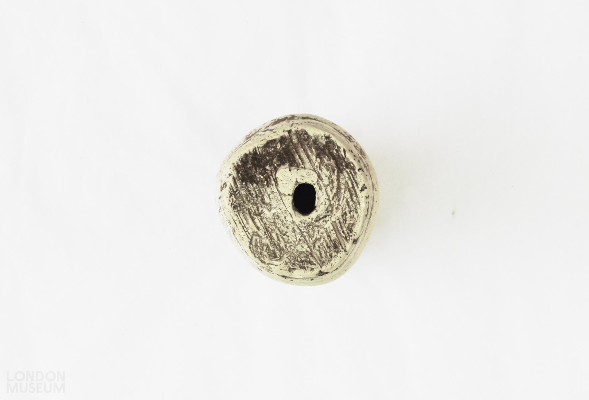 Large wig curler. Two large holes at either end, hollow throughout. Two circular grooves around wig curler at each end.