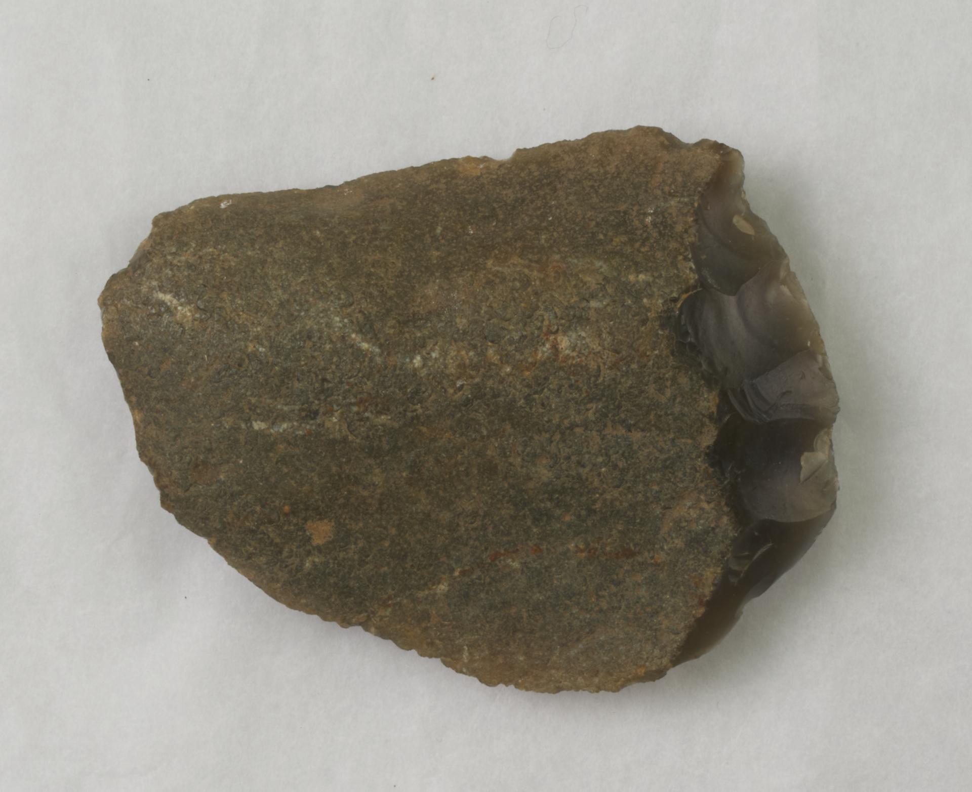 Flint scraper with cortex on dorsal face. Possibly side and end scraper. One long edge and distal edge have been retouched.