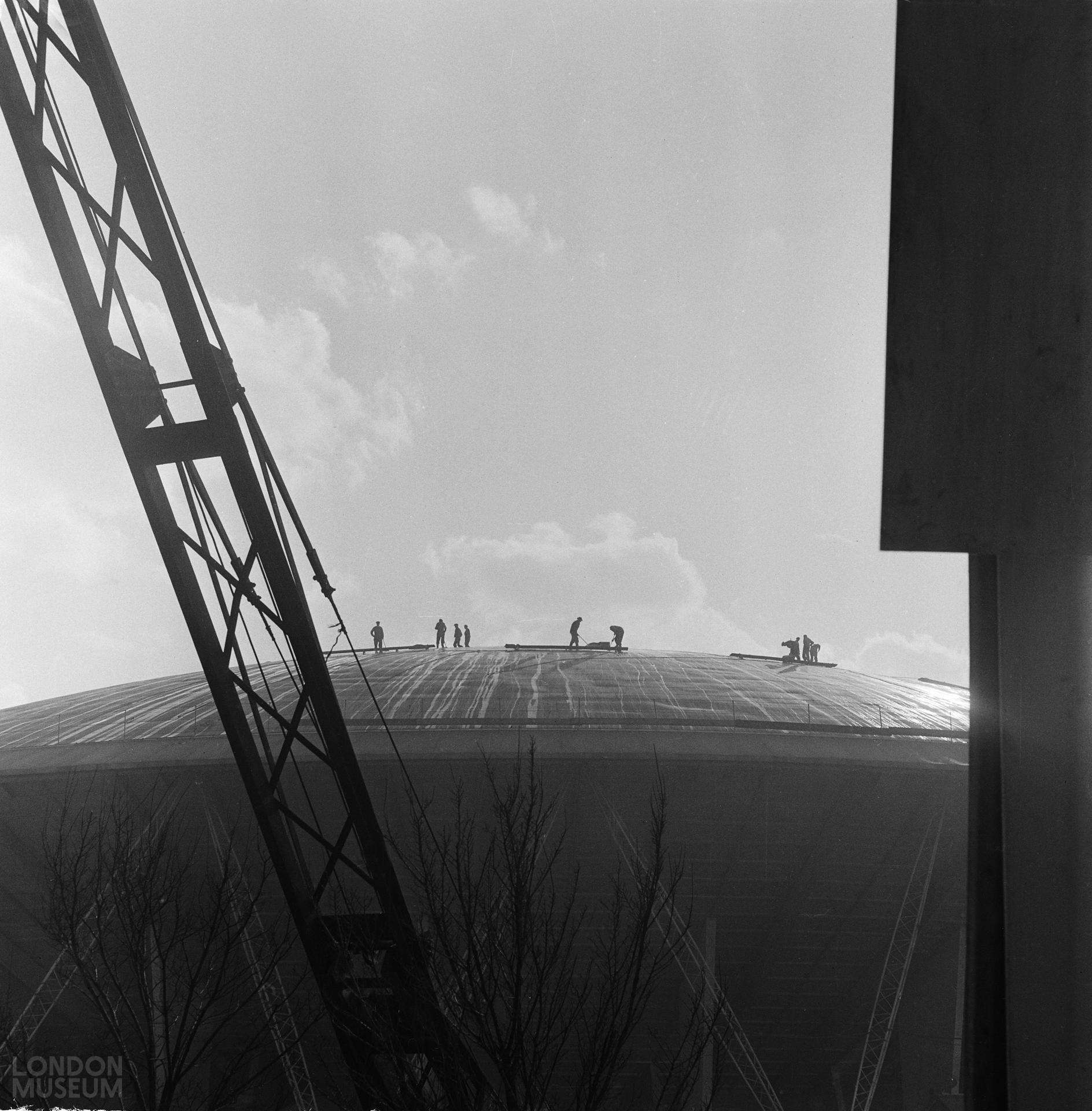 Construction workers on the roof of the Dome of Discovery. The Dome was one of the most dramatic structures built for the Festival of Britain in 1951. Designed by architect Ralph Tubbs it was the largest Dome in the world at that time measuring 365 feet in diameter.