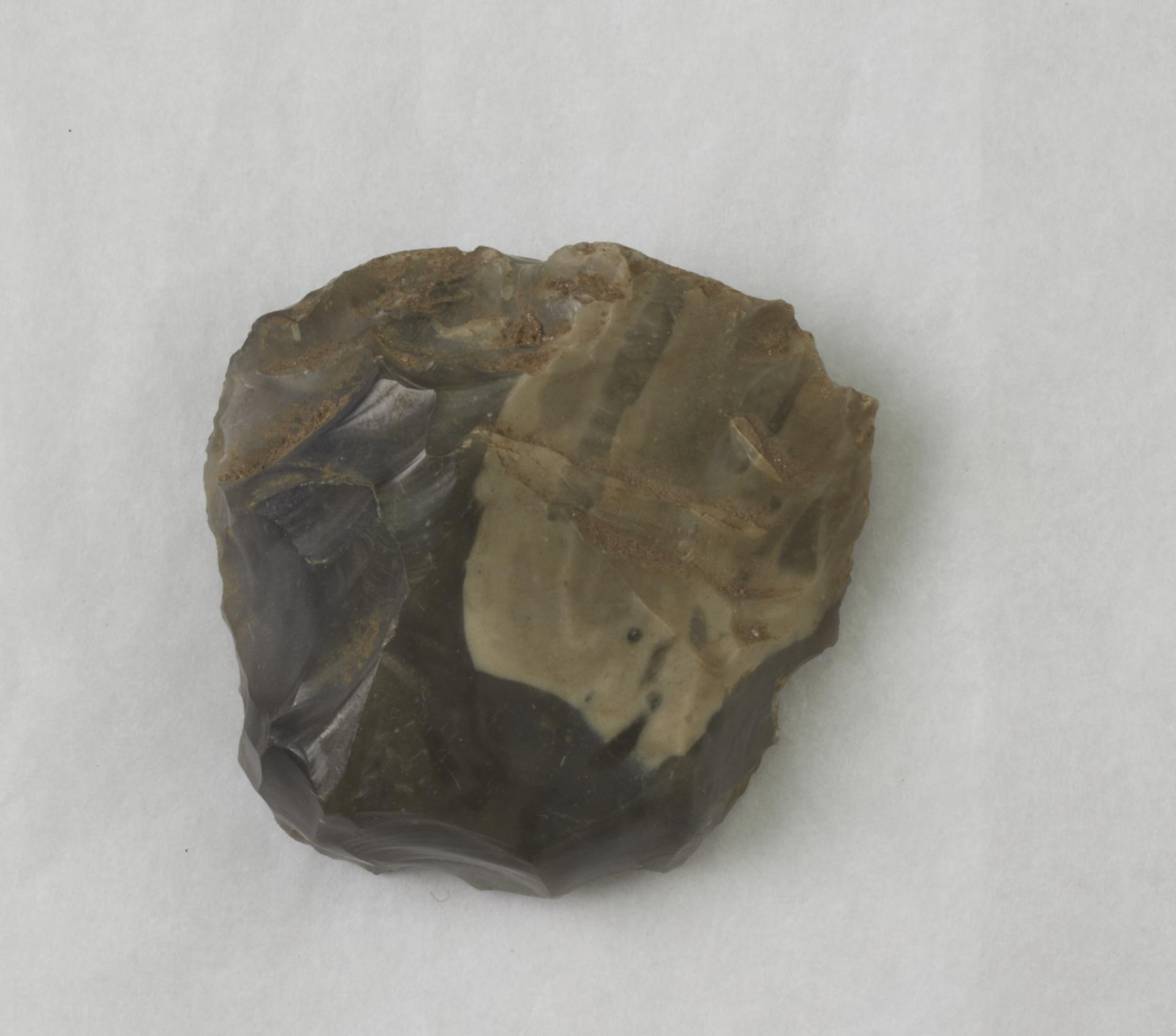Flint scraper. Possibly disc scraper. Roughly circular in shape. Almost the whole edge has been retouched. One side is smooth.