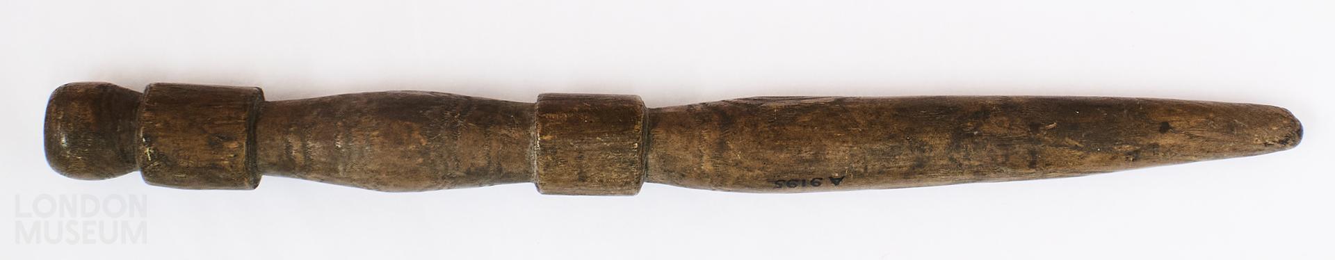Knitting needle case of wood, 18th century. It consists of a long wooden tube which has been turned.