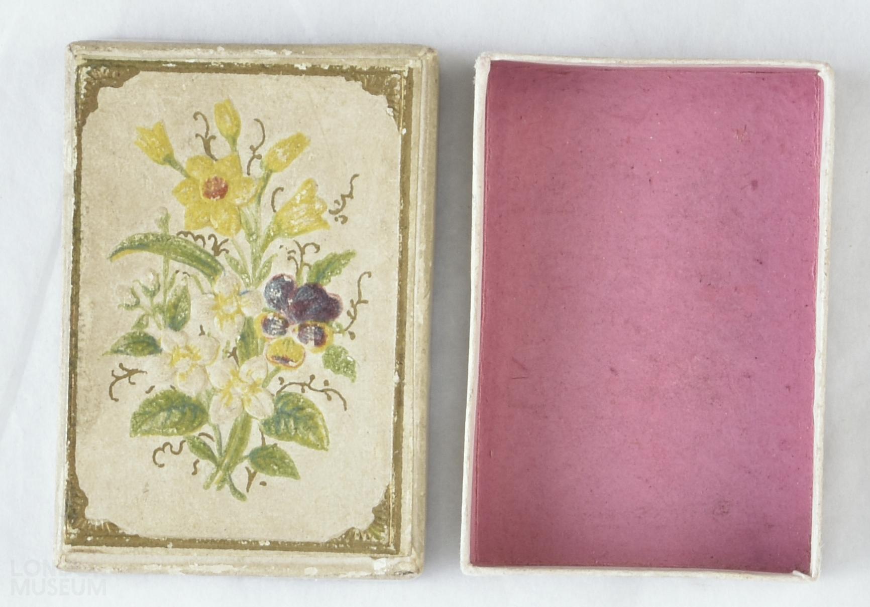 Small rectangular white cardboard pin box in two parts, pink inside and on the back.