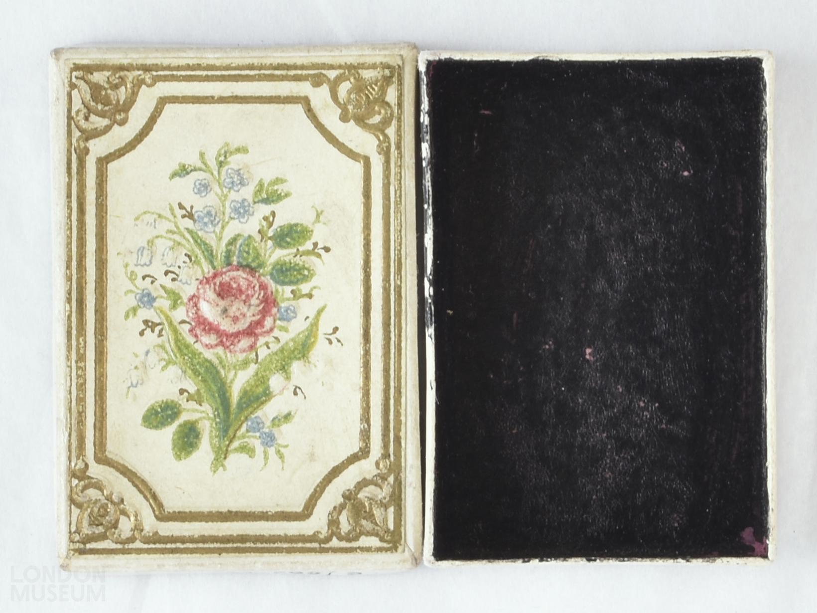 Small rectangular white cardboard pin box with lid. The interior of the box base is black and the interior of the lid and the back of the box is pink.
