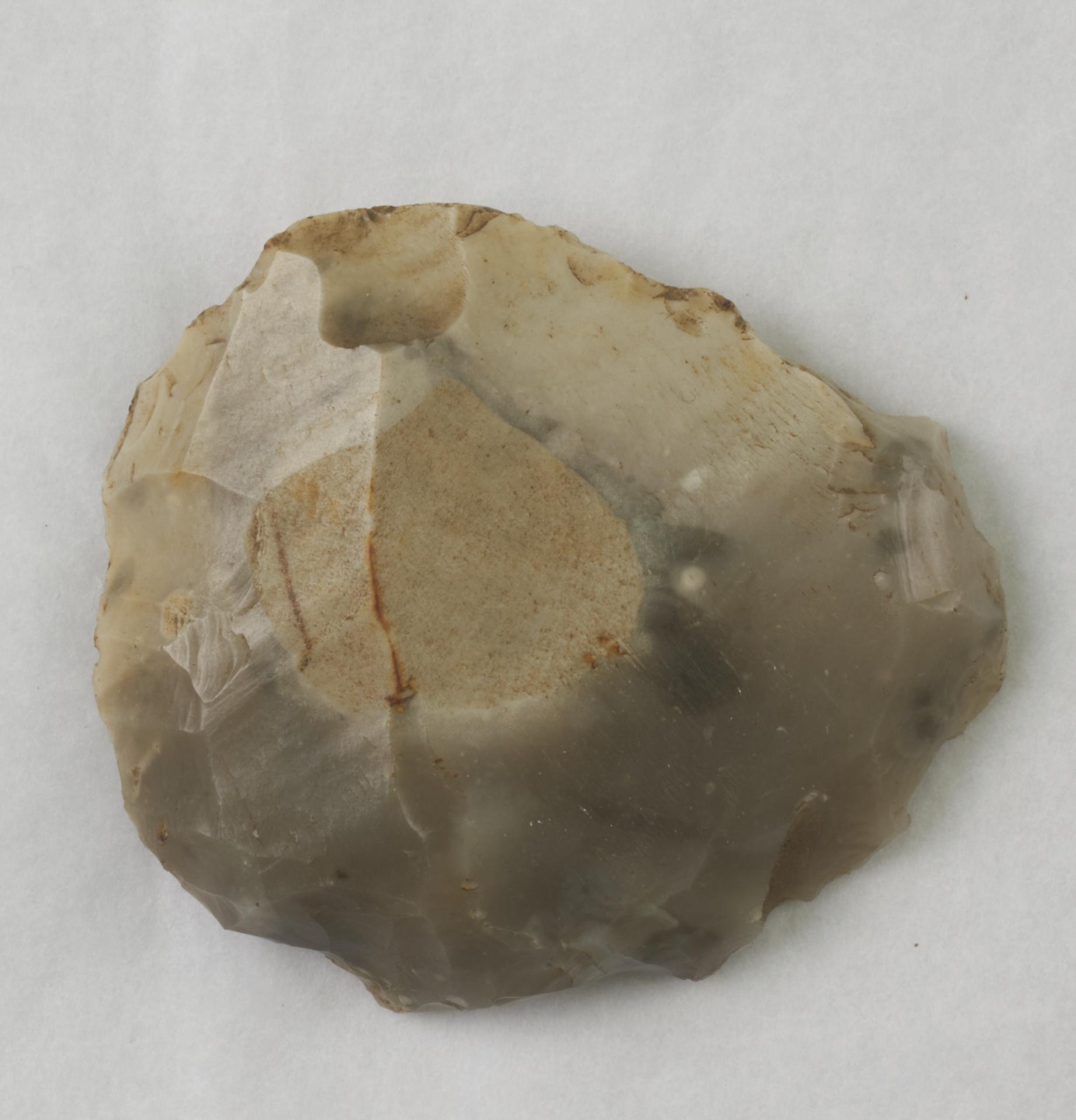 Flint scraper. Possibly a side and end scraper. Both top and bottom and one long edge has been retouched. Both sides are smooth.