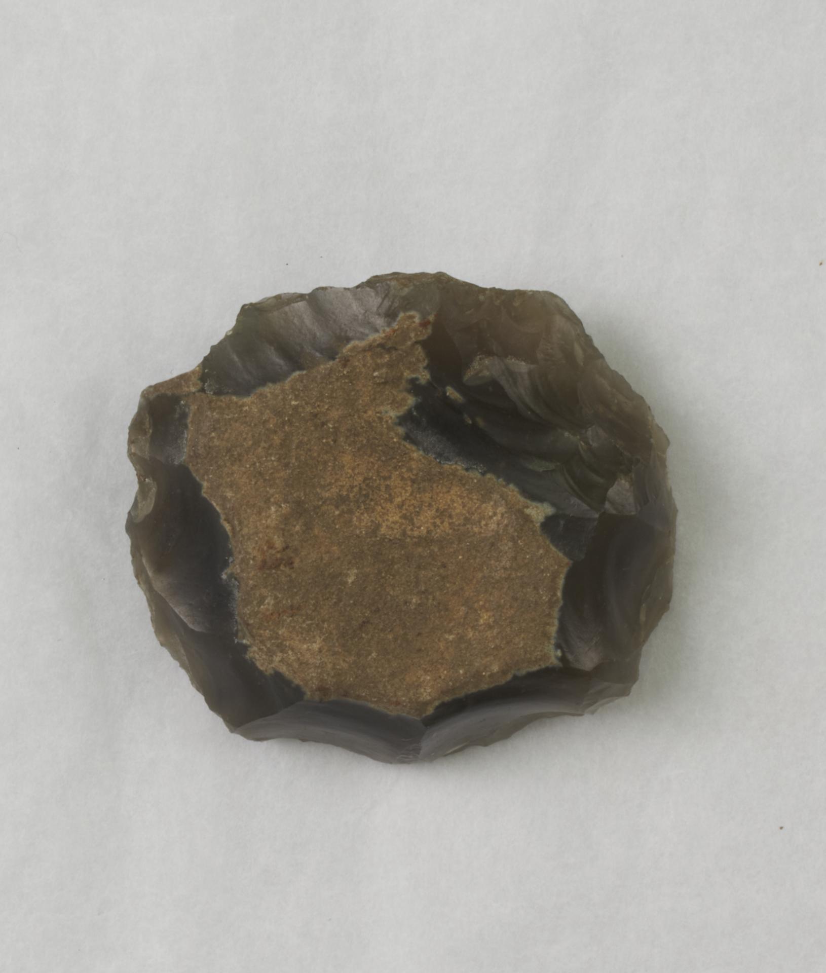 Scraper of glossy flint. Roughly circular in shape. Possibly a disc scraper. Almost the whole edge has been retouched.