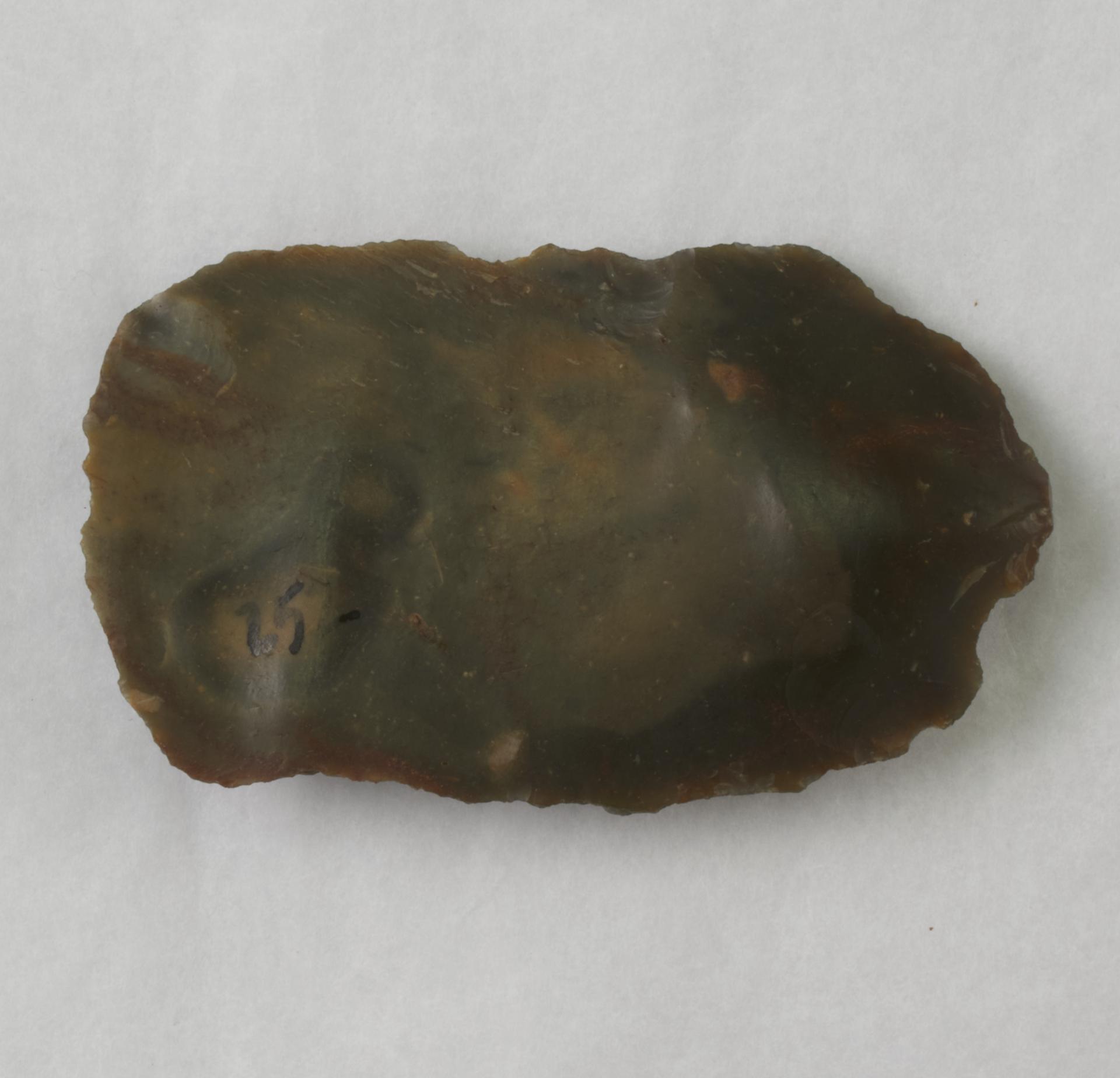 Scraper of glossy flint. Possibly an end and side scraper. Both long ends and distal end have been retouched. Roughly rectangular in shape.