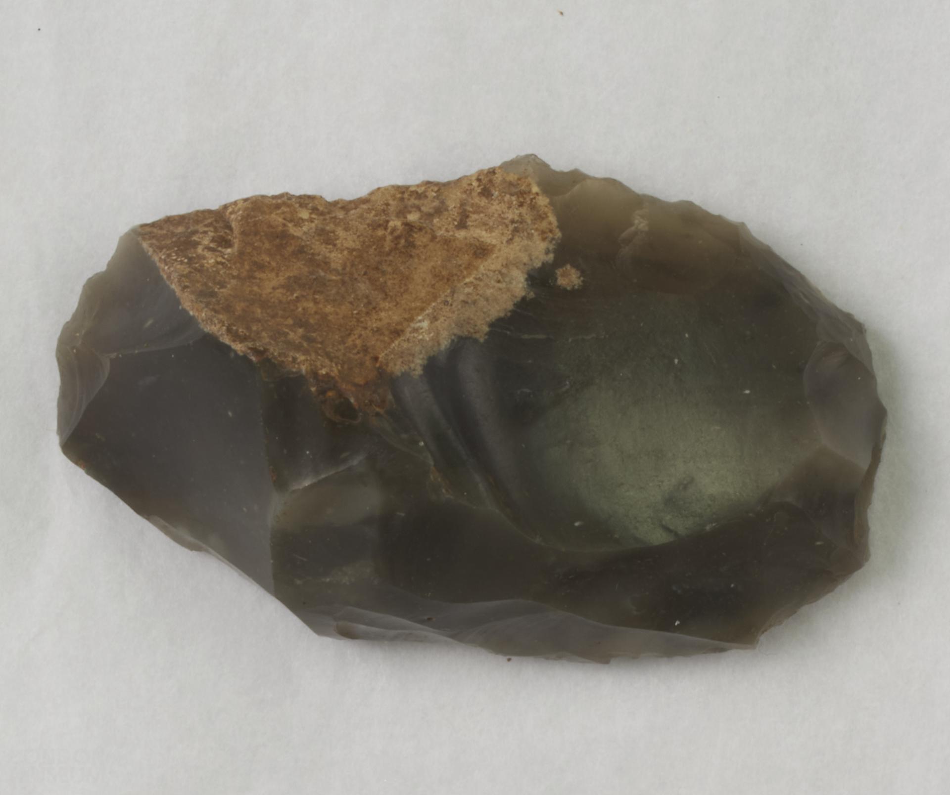 Flint scraper. Roughly rectangular in shape with rounded corners. Possibly a side and end scraper. One long edge and distal edge have been retouched. Signs of inclusion. One side is smooth.