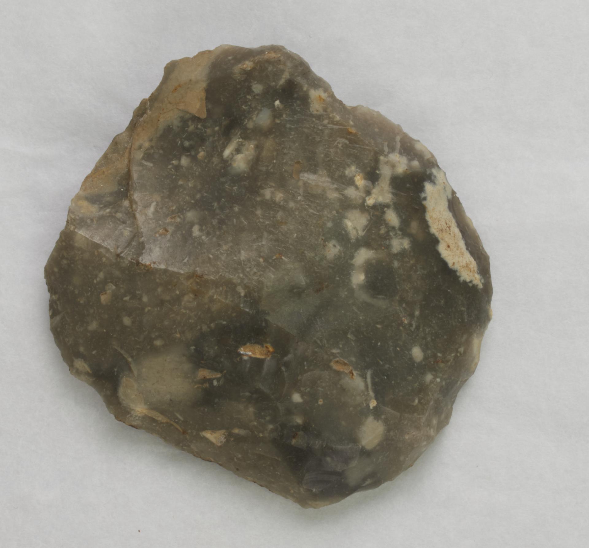 Flint scraper, square shaped. Possibly an end and side scraper as one long edge and the distal edge have been retouched.