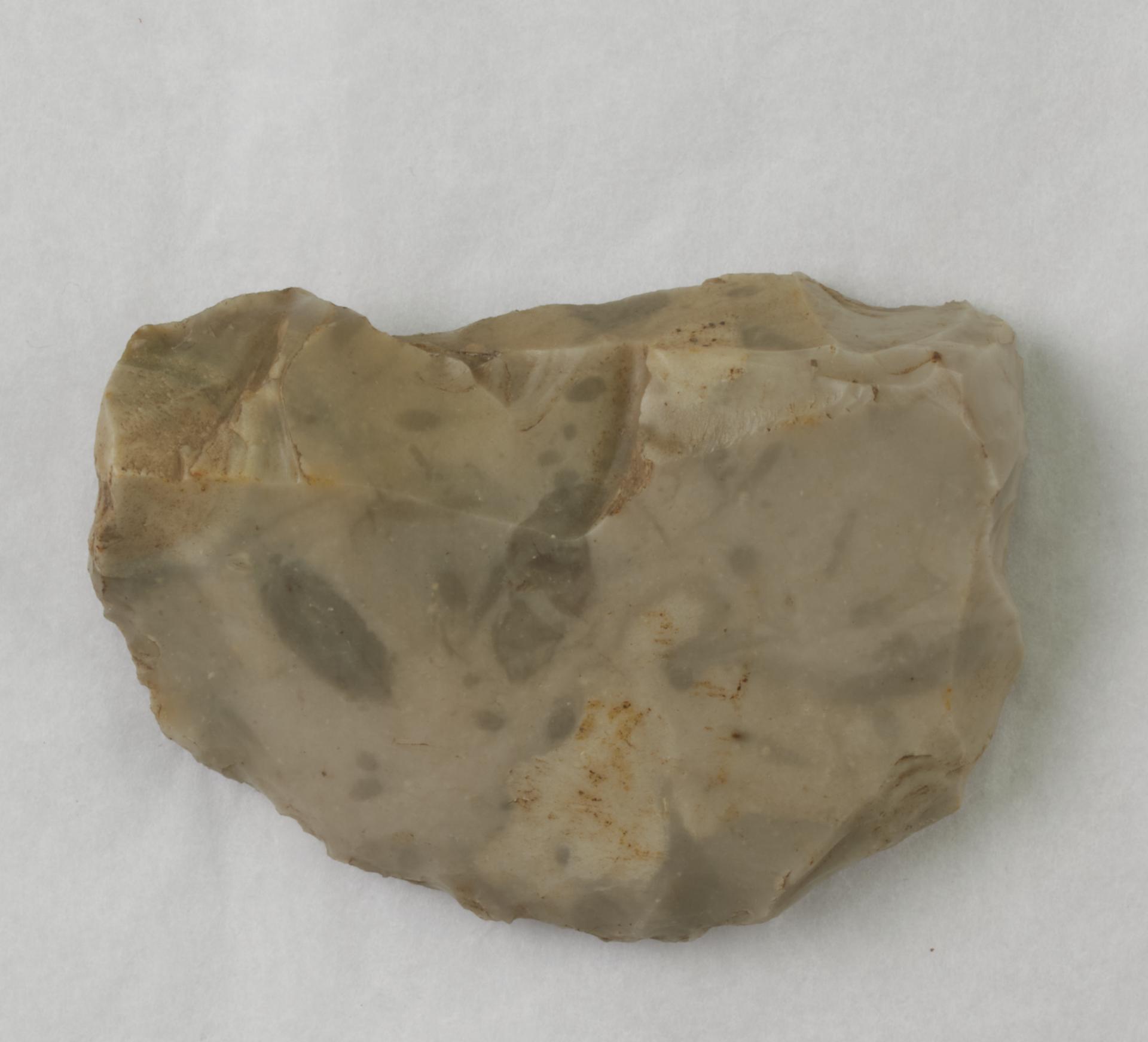 Flint scraper, possibly a side and end scrapper. One long edge and distal end retoruched.