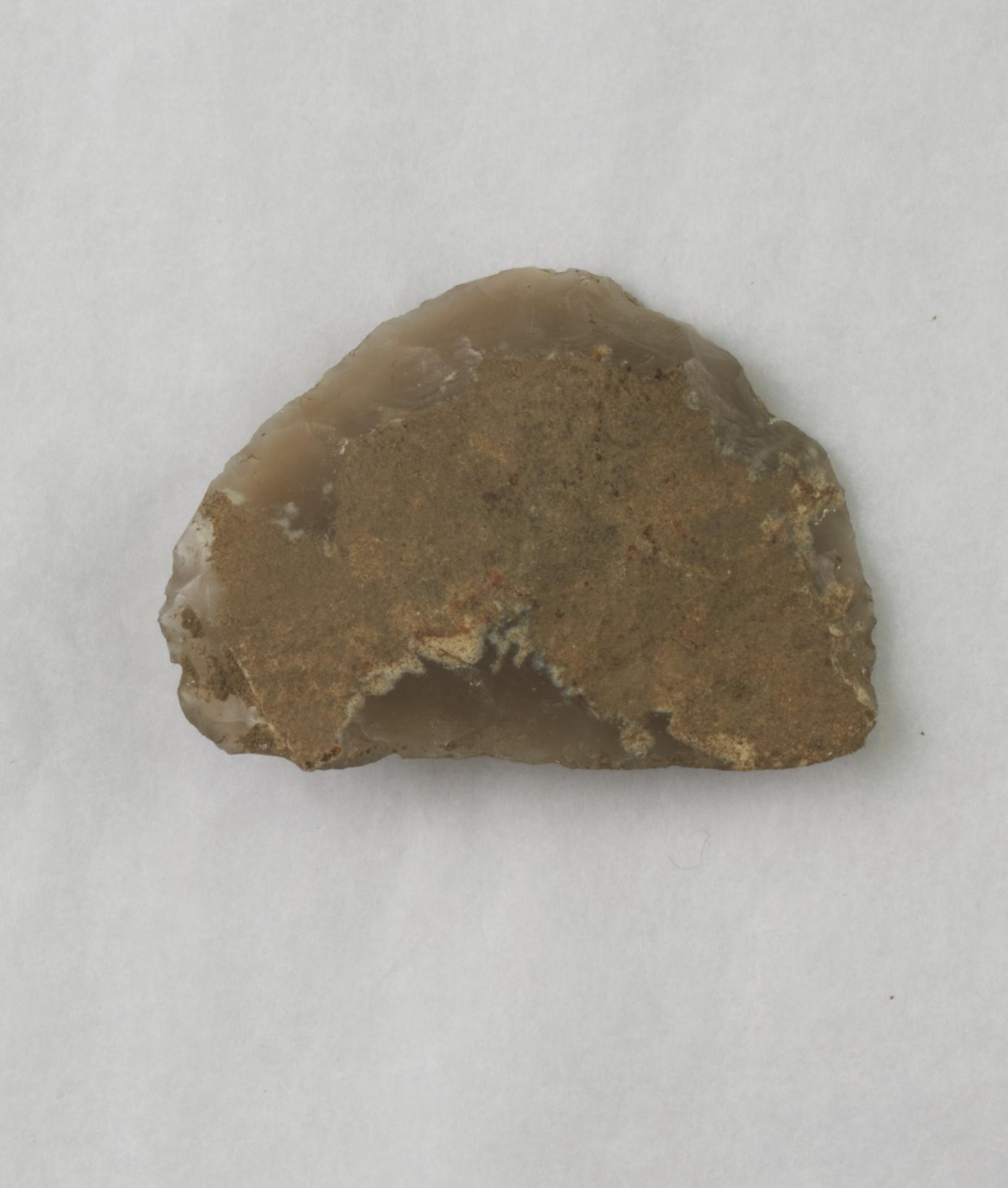 Flint scraper. Roughly semi-circle shaped. Rounded end has been retouched.