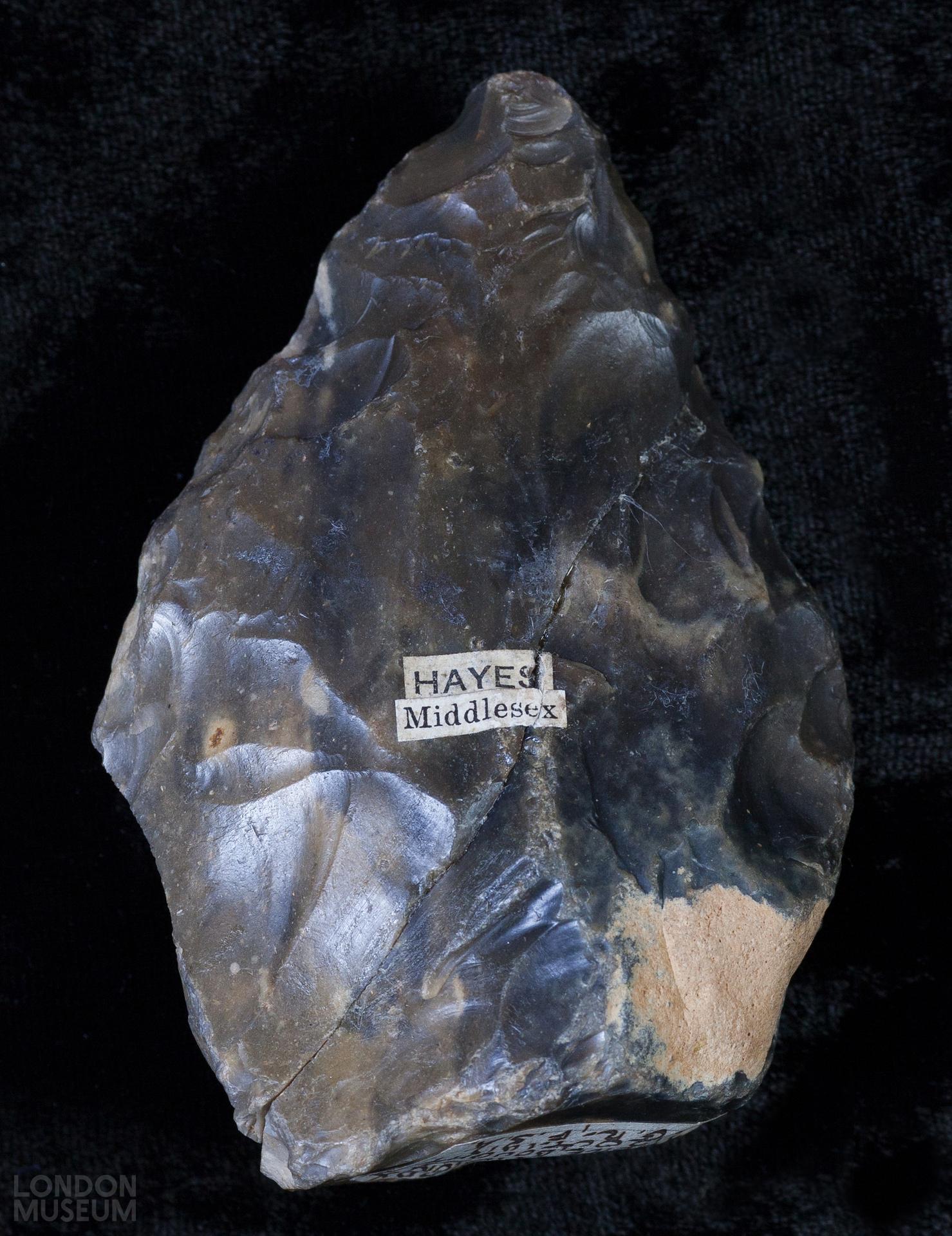 Small flint handaxe. Grey, slightly stained surface. Rolled, with some old damage near the base.