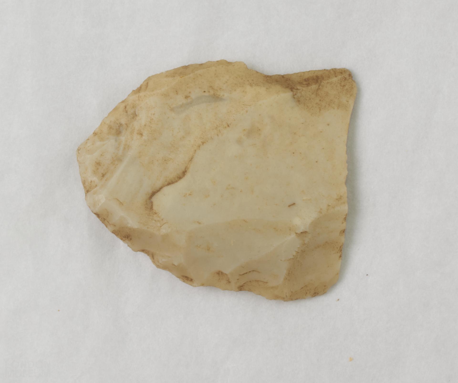 Side scraper of patinated white flint made on a broken blade. One long edge has been retouched.
