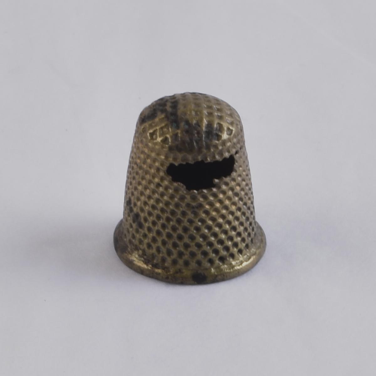 Small copper alloy thimble designed for a child to use. It has square indentations on the tip, and round ones around the edge. There is a hole close to the tip.