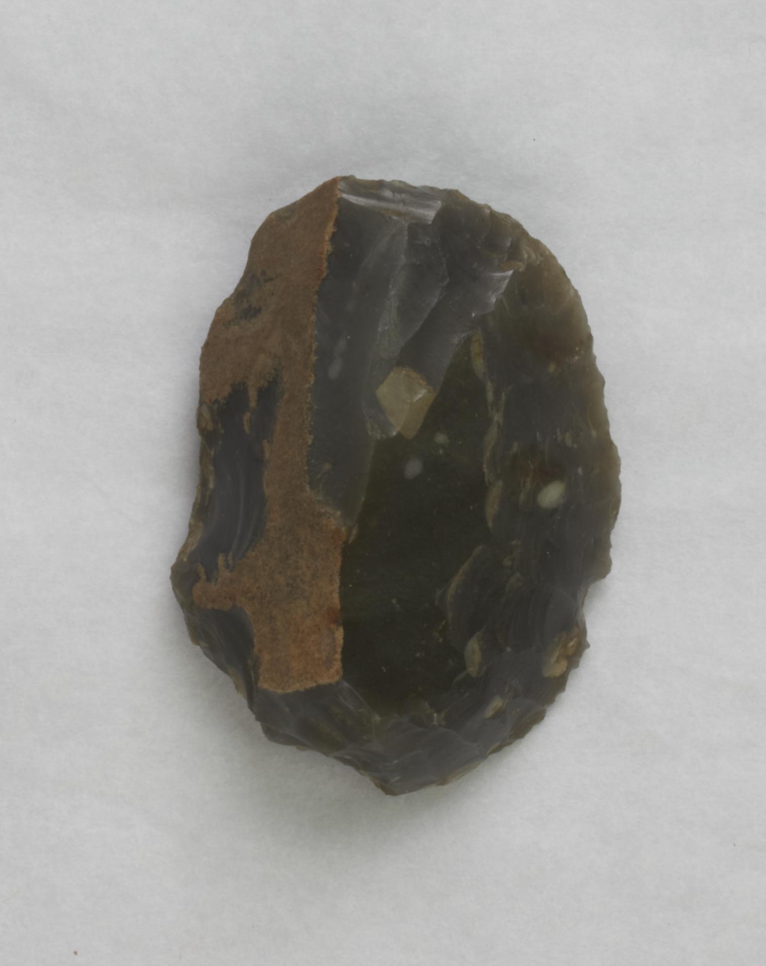 Broad flint scraper made on a thick flake. One long edge has been retouched.