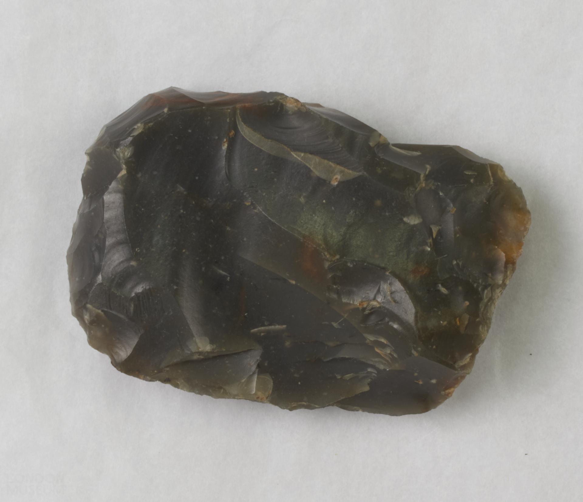 Flint scraper. One thin edge that has been retouched. Other edges are wide and mostly flat. Irregular shape. 53 is marked on one side. Possibly a side scraper.